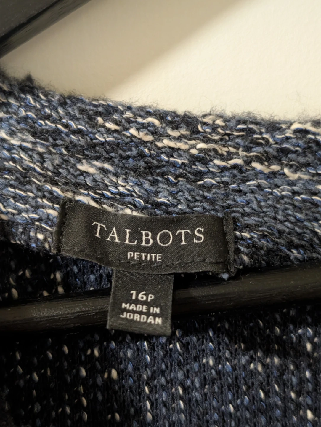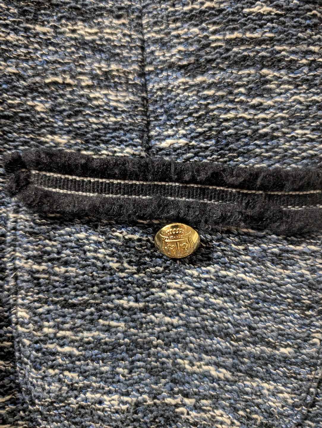 Talbots Petite dress in a speckled blue tweed fabric. It has two front pockets with decorative buttons and trim. Size is 16 Petite.