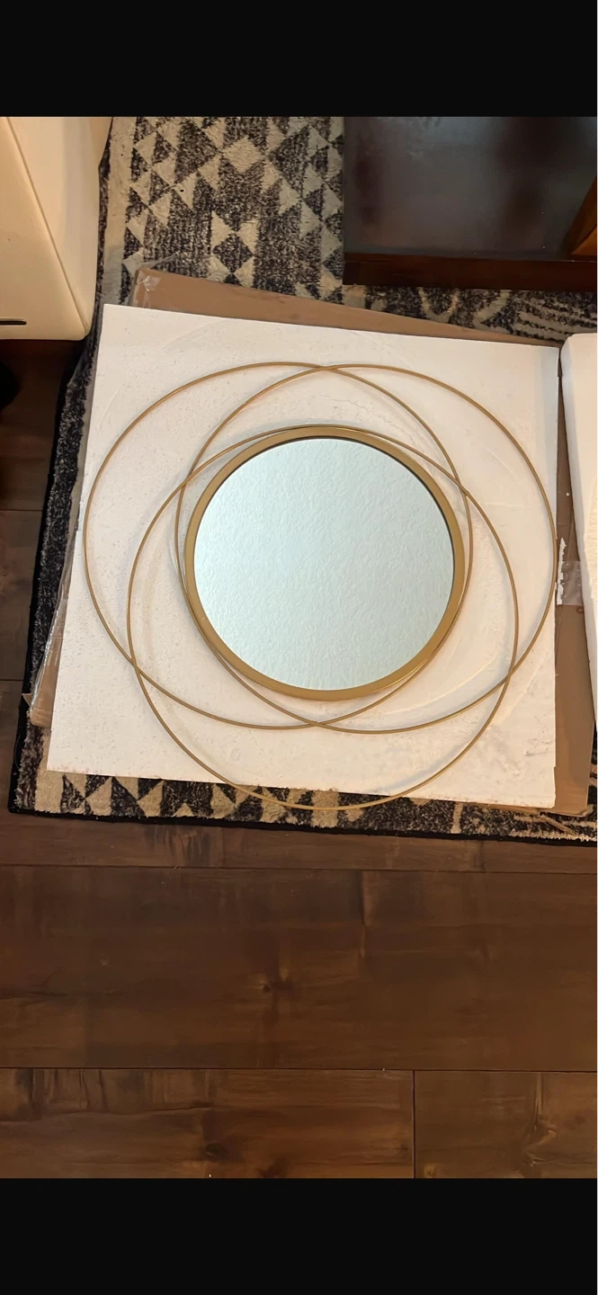 Round mirror with a gold metal frame. It features an overlapping geometric design for added style. Perfect for adding a decorative touch to any room!