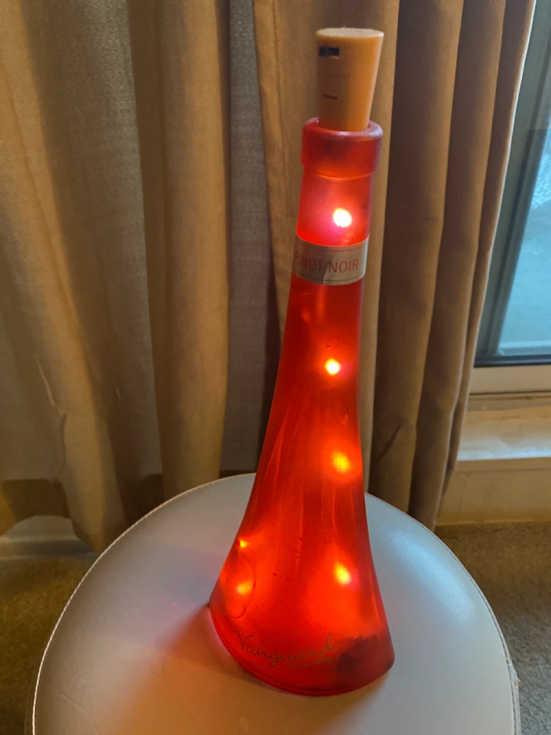 This is a decorative red bottle that has been filled with lights. It's branded Vanguard and says Pinot Noir on it. It has a cork stopper light controller with switch to on /off.