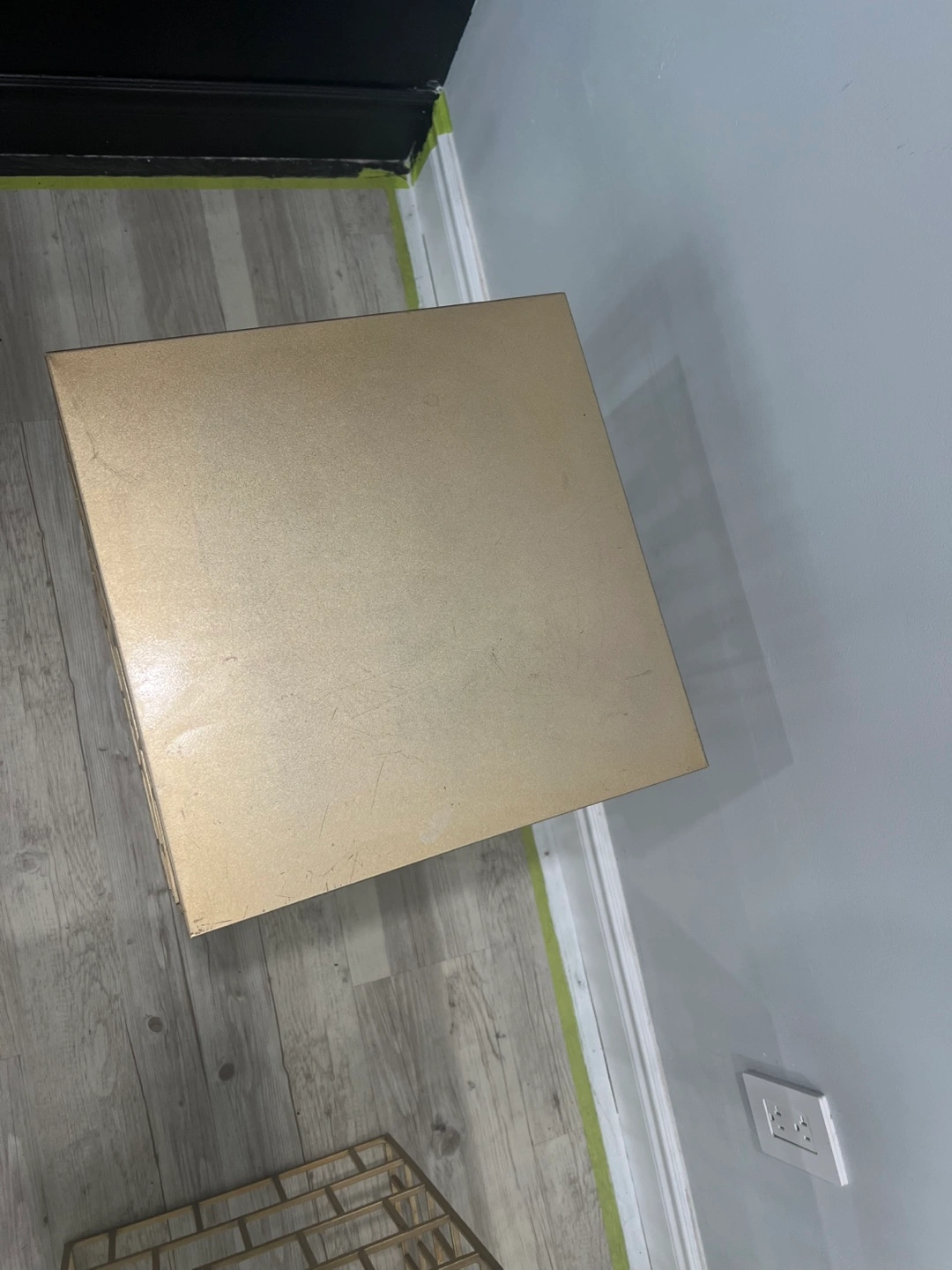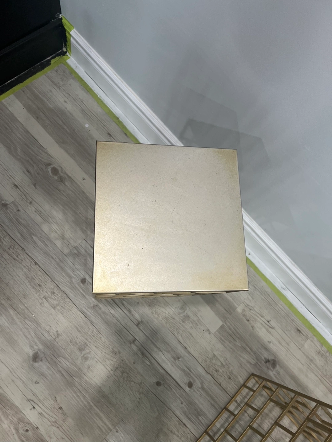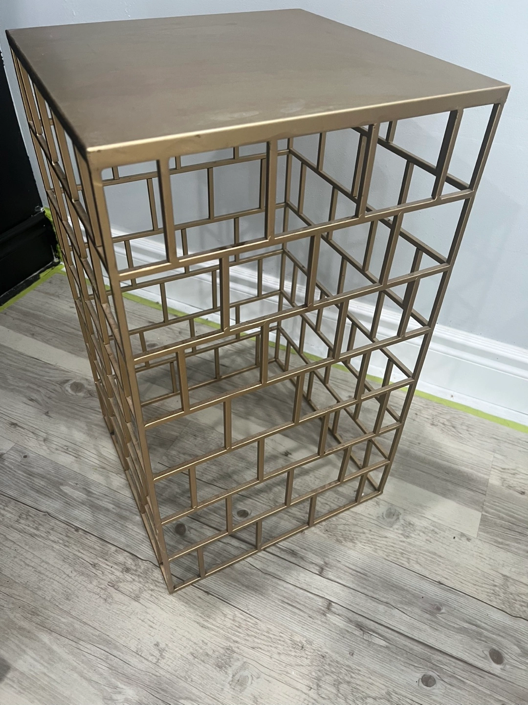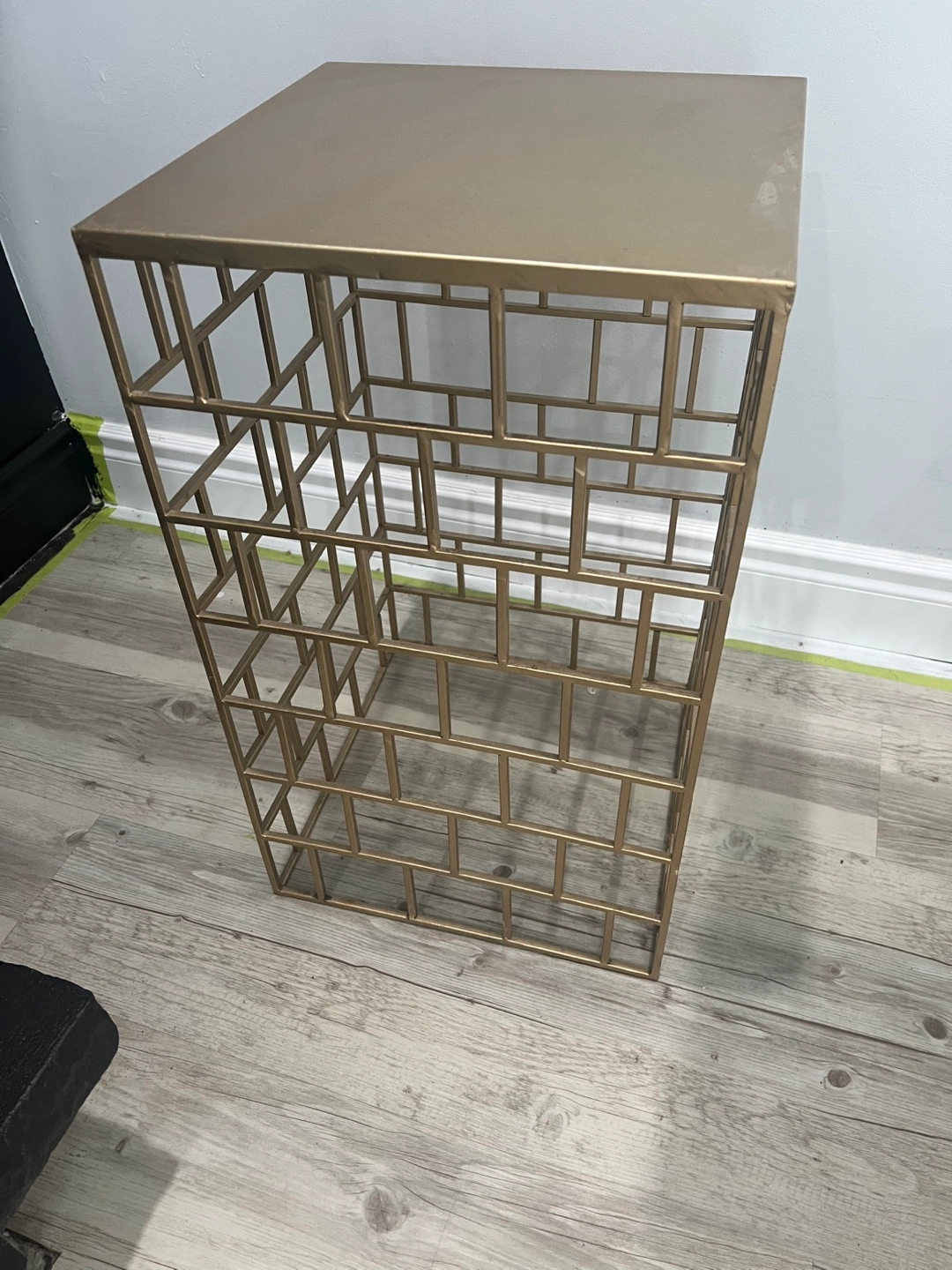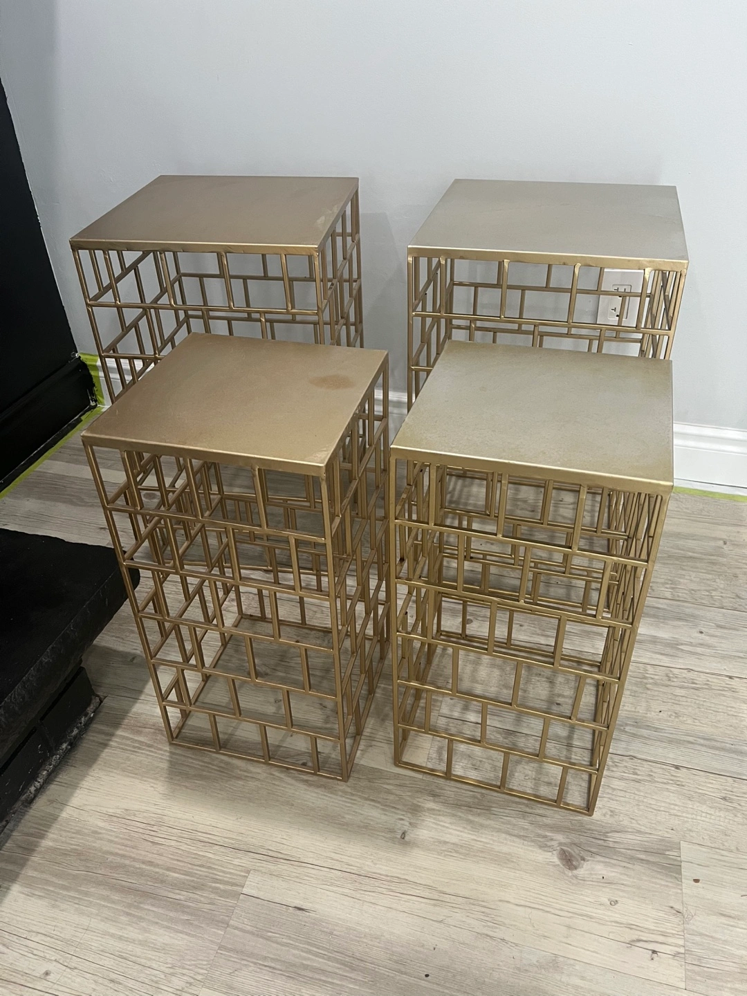 (4) Piece Side table set. Metallic gold finish. Square top. Geometric design. Perfect for displaying treasured items and bringing a sense of tranquility to your living space.