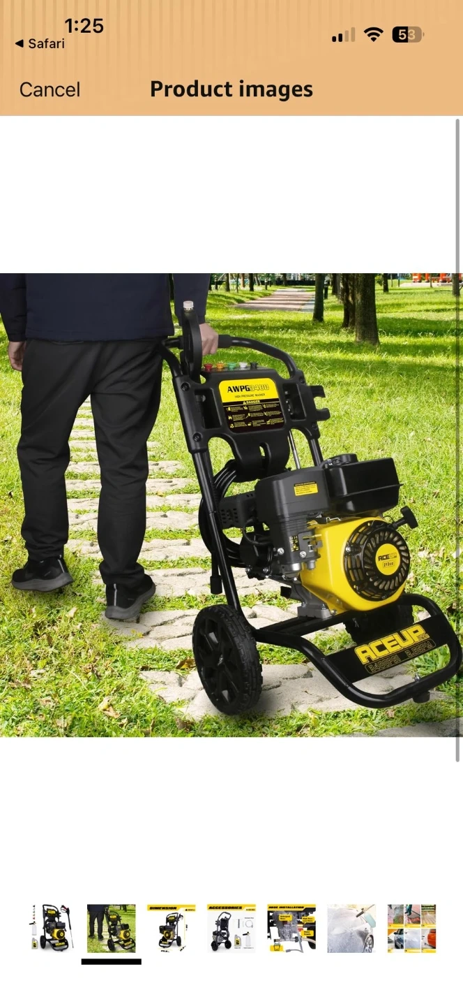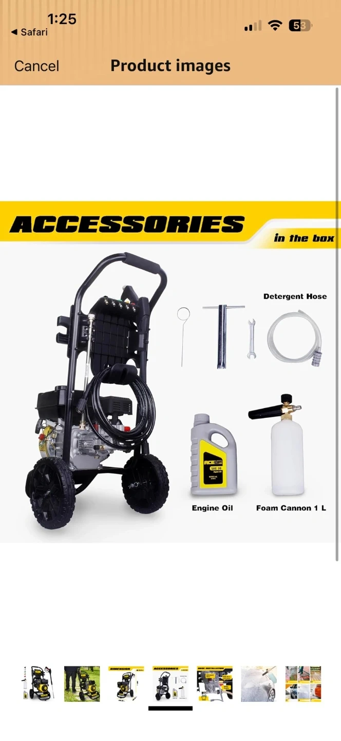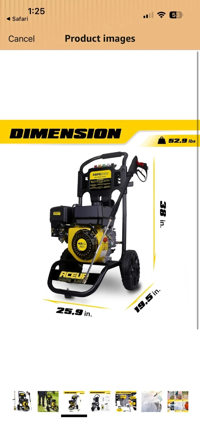 This AceuP pressure washer is a 25.9-inch long, 19.5-inch wide, and 38-inch tall unit. It weighs 52.9 lbs and comes with engine oil, detergent hose, and a foam cannon. Perfect for tackling tough cleaning jobs around the house!