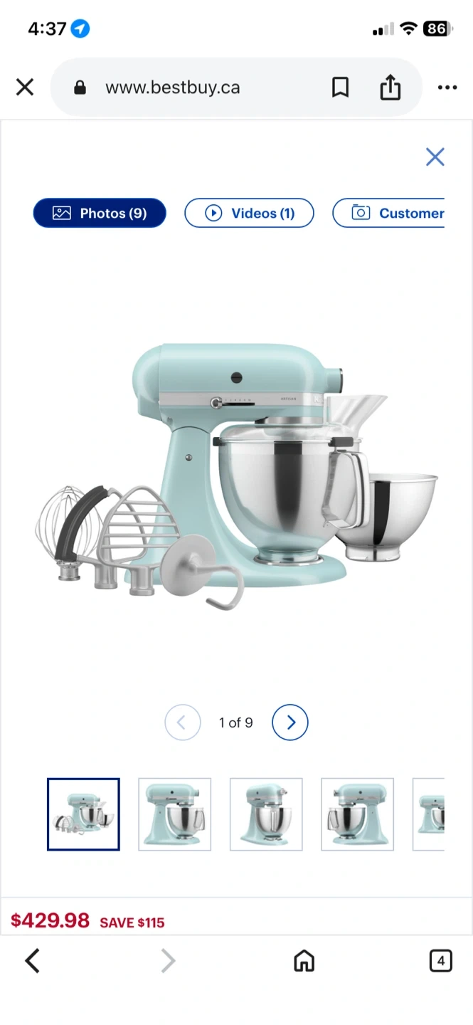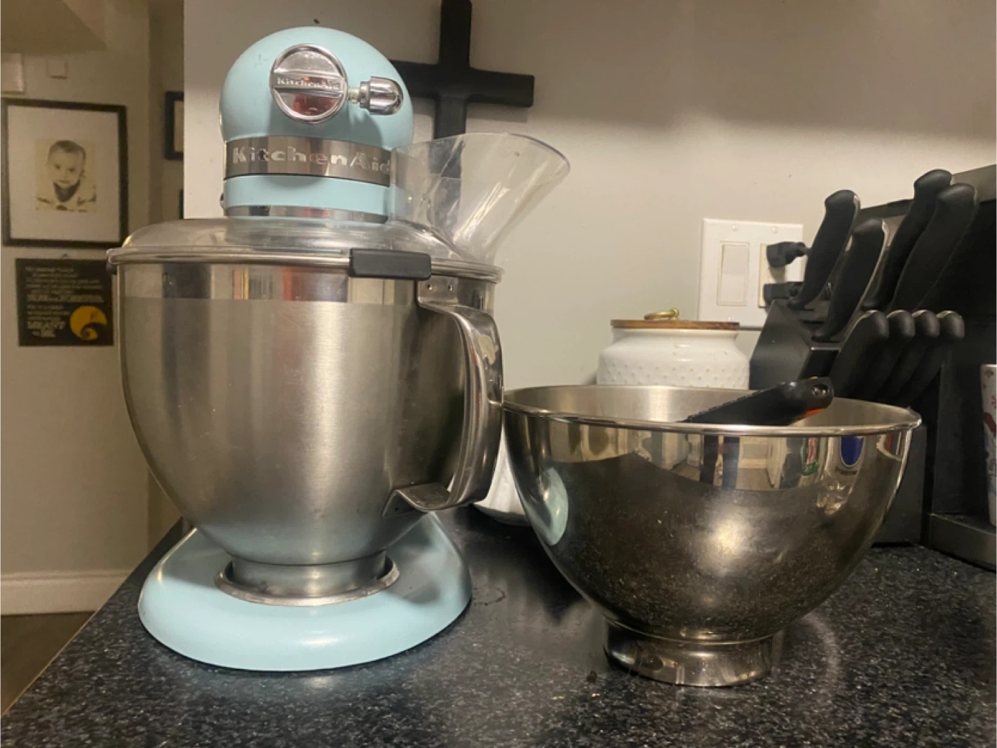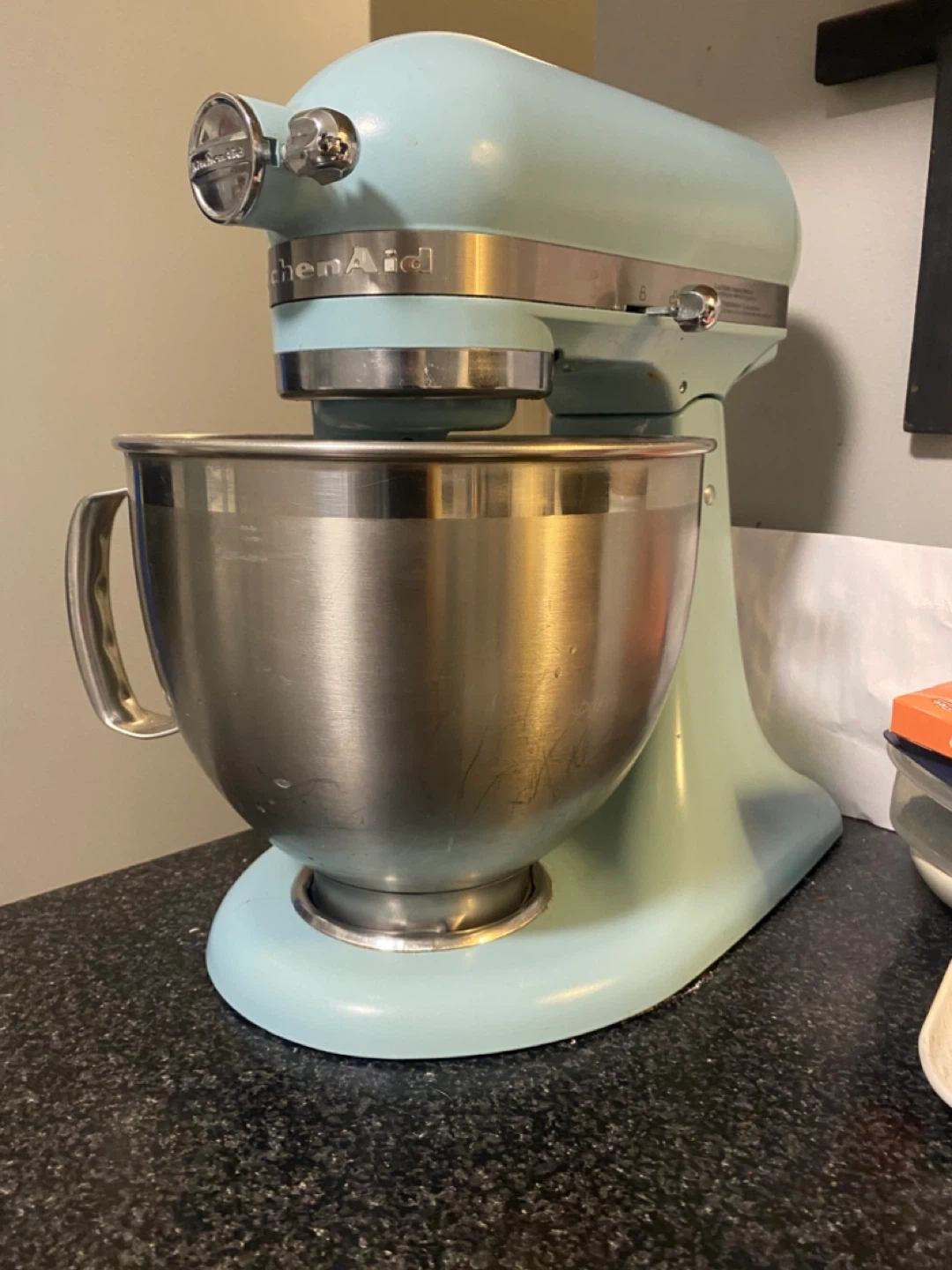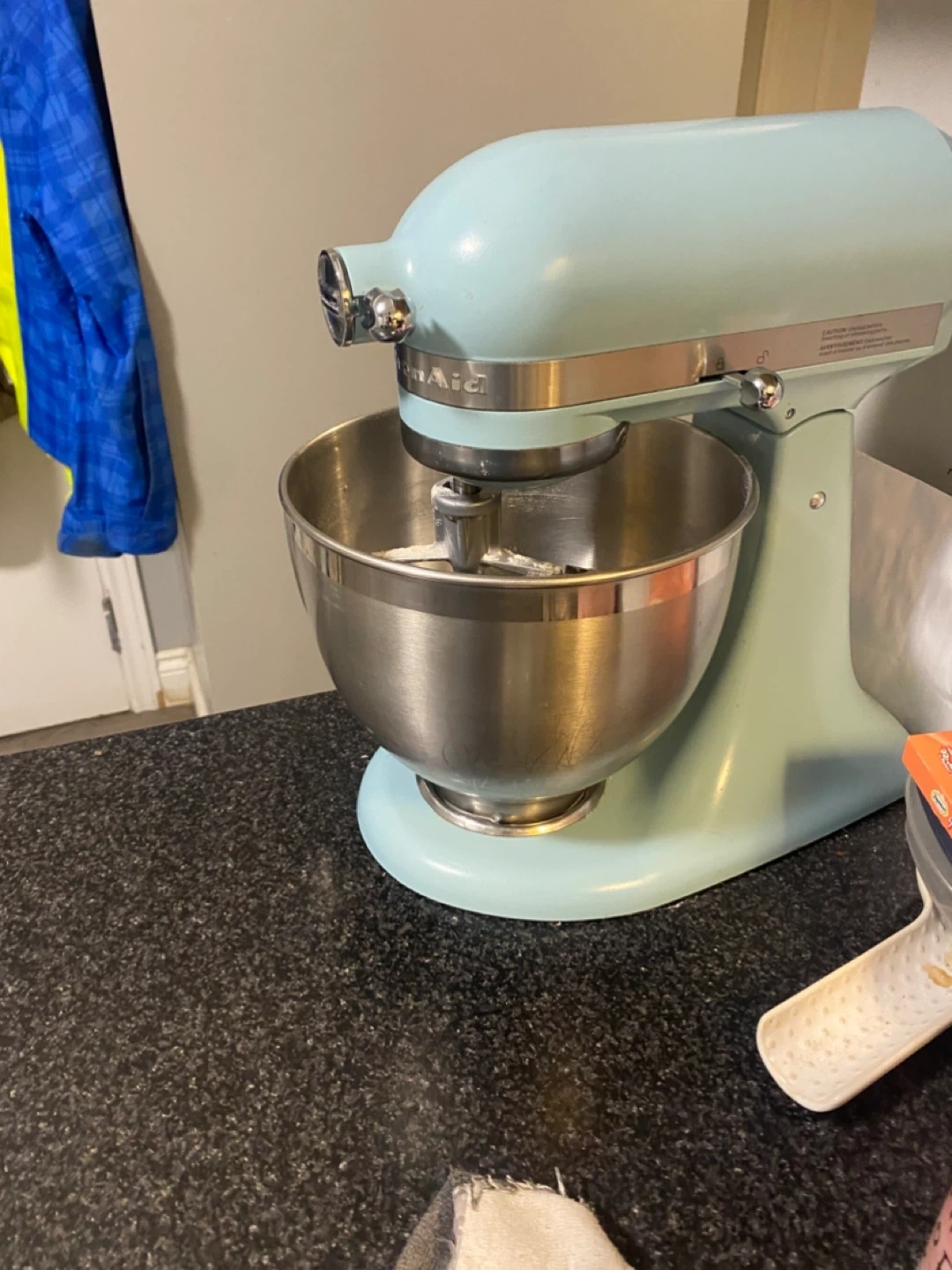 This is a KitchenAid Artisan stand mixer in a lovely ice blue colour. It comes with the standard attachments. It's perfect for all your baking needs!