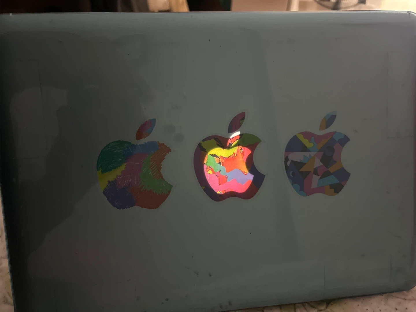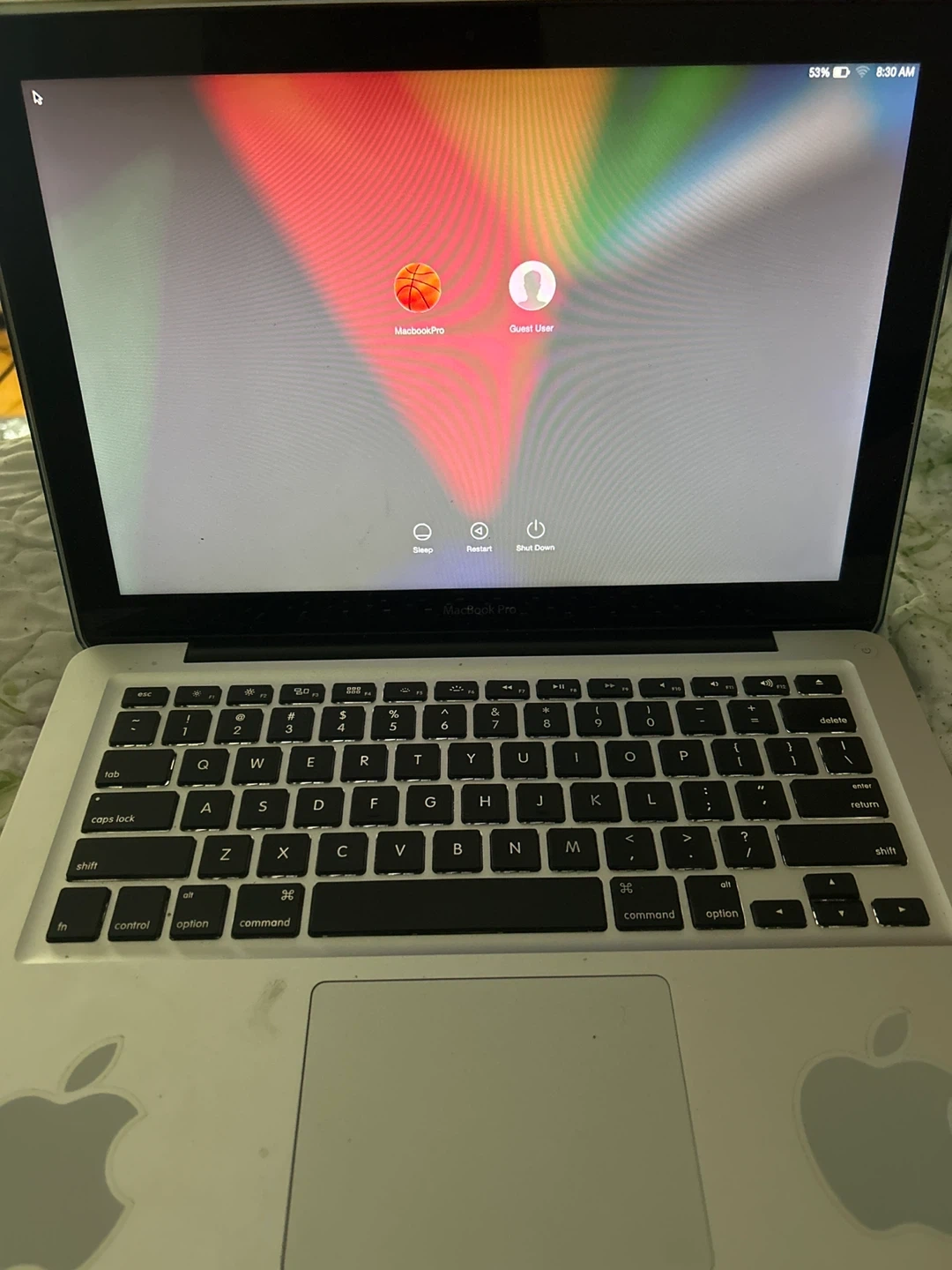 This is an Apple MacBook Pro laptop. It has a silver casing and a black keyboard. The screen displays the login prompt for "MacBook Pro." Some decorative stickers are present on the lid.