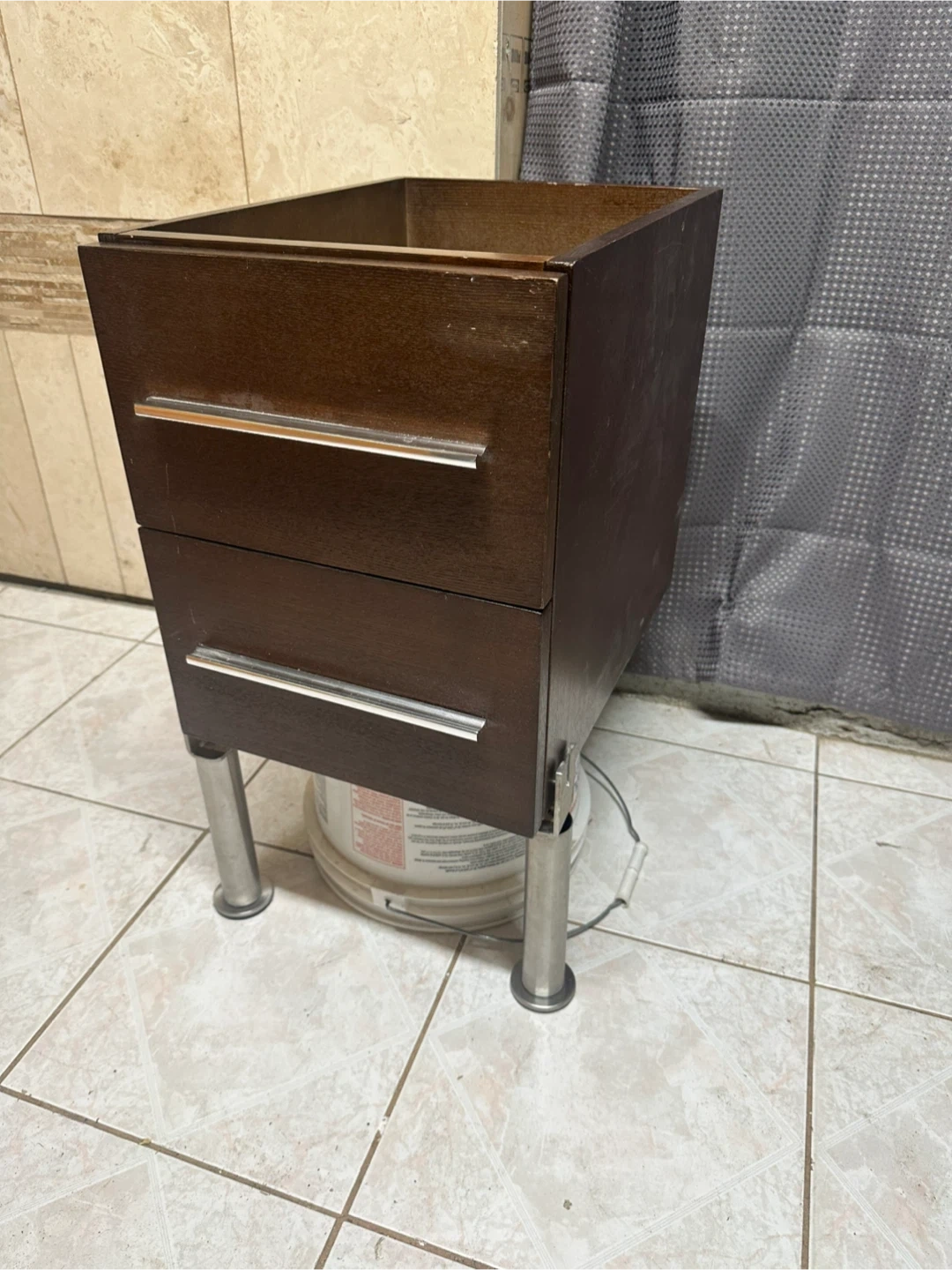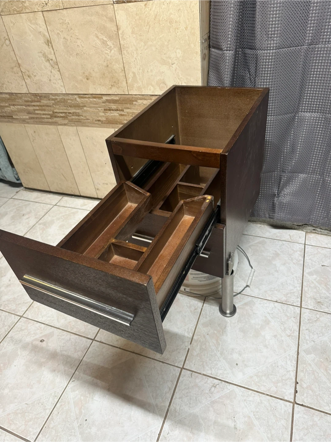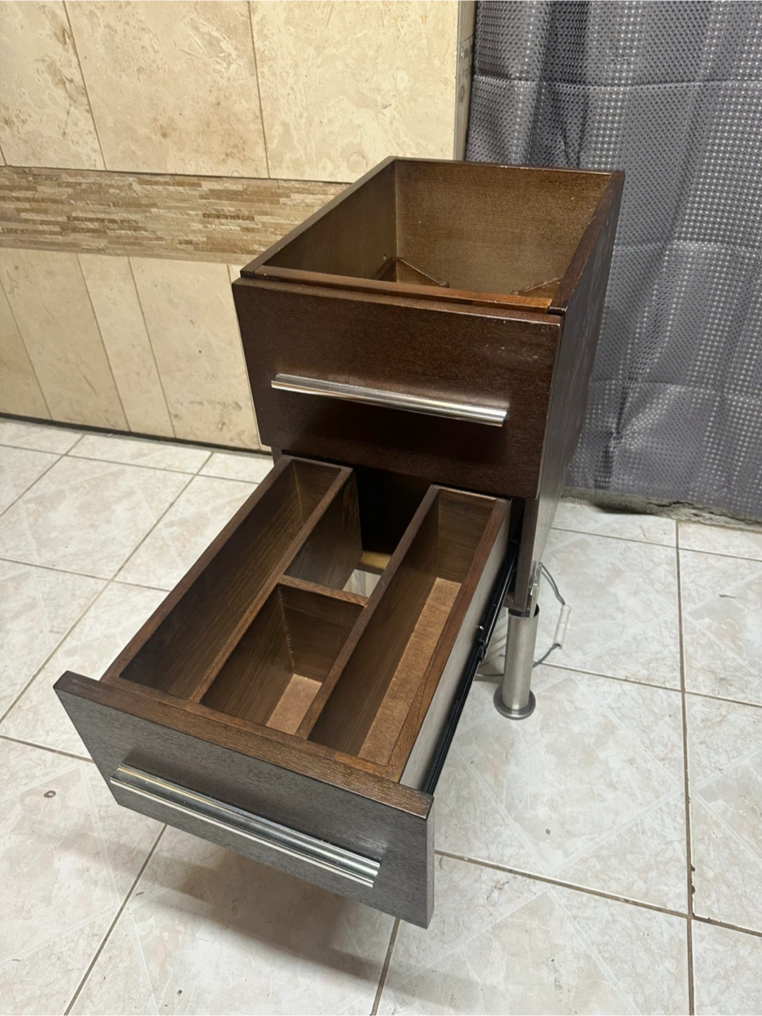 Dark wood cabinet featuring two smooth‑sliding drawers with long metal handles.