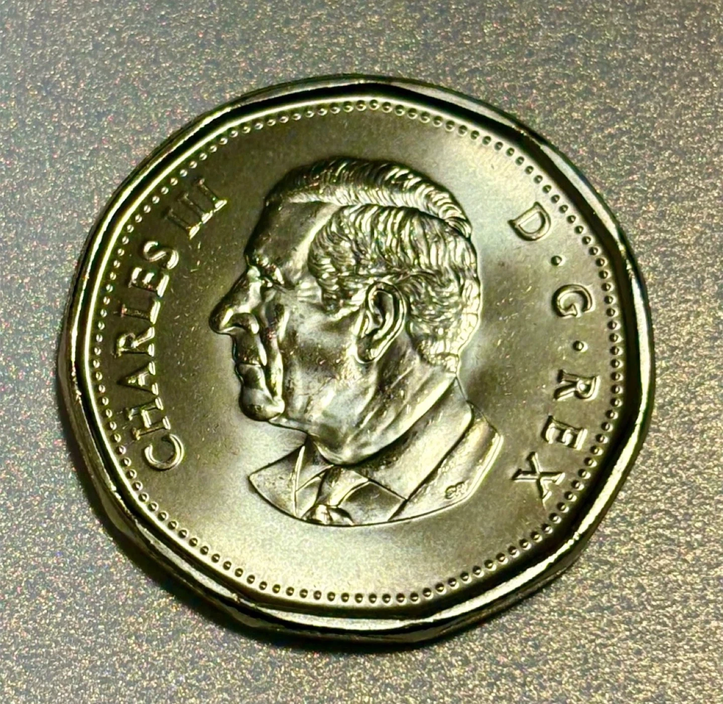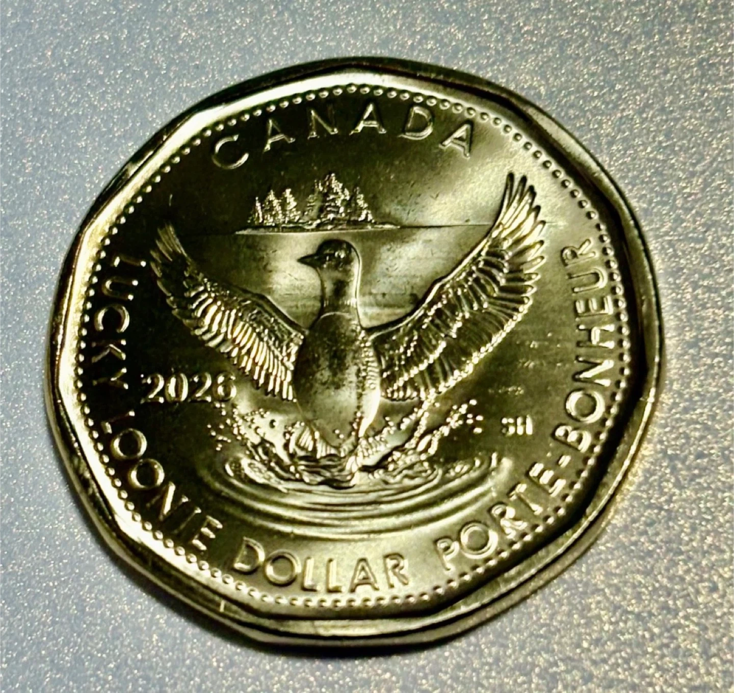 This is a 2026 Canadian one dollar coin featuring the lucky loon design. It depicts a loon in flight over water, a symbol of good luck. The coin also features King Charles III on the obverse.