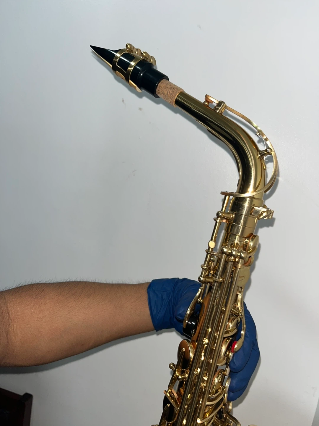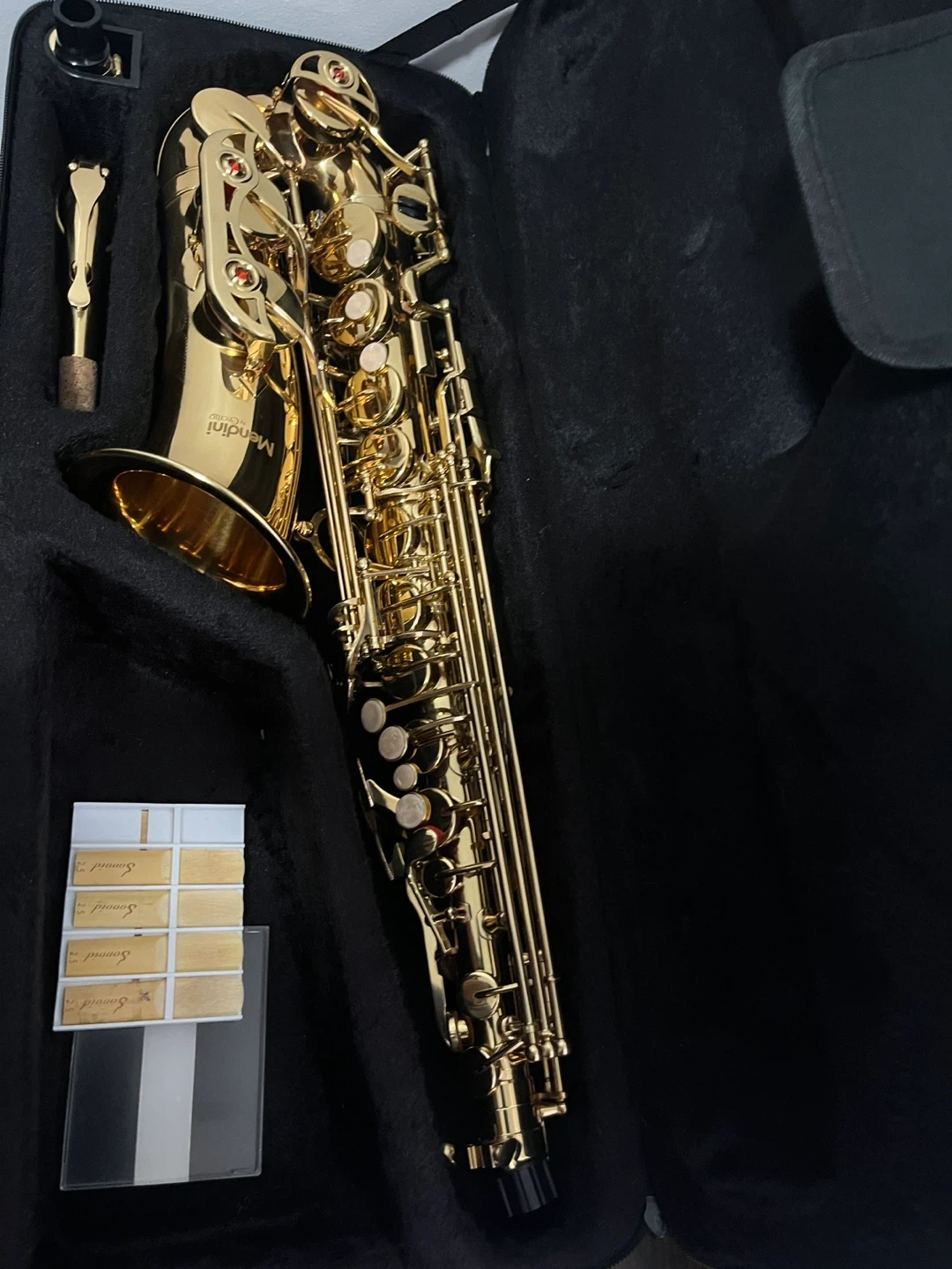 This is a Mendini by Cecilio alto saxophone. It's gold in color and includes a case, reeds, and cleaning supplies. This instrument is great for beginners or intermediate players looking for a reliable saxophone.