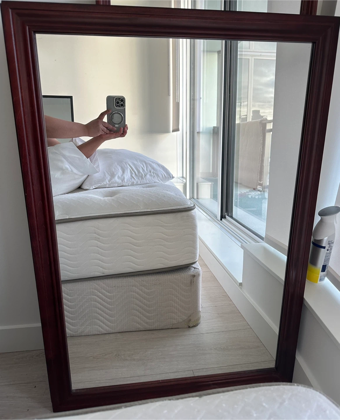 Selling a framed wall mirror! It has a dark wood frame. The mirror is in good condition and ready to add some style to your space