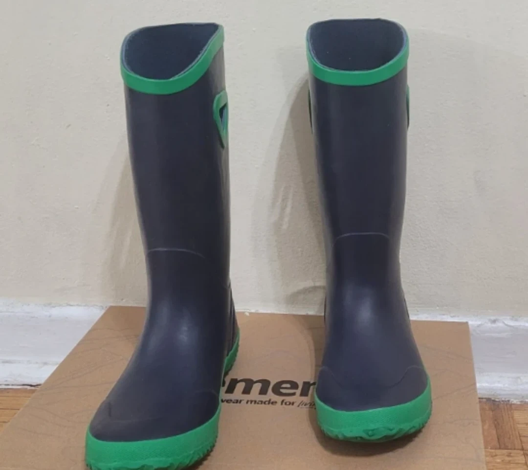 Navy blue rain boots with green trim and soles. Rubber upper and outsole. Size 5. Unisex. Original Box. Price negotiable.