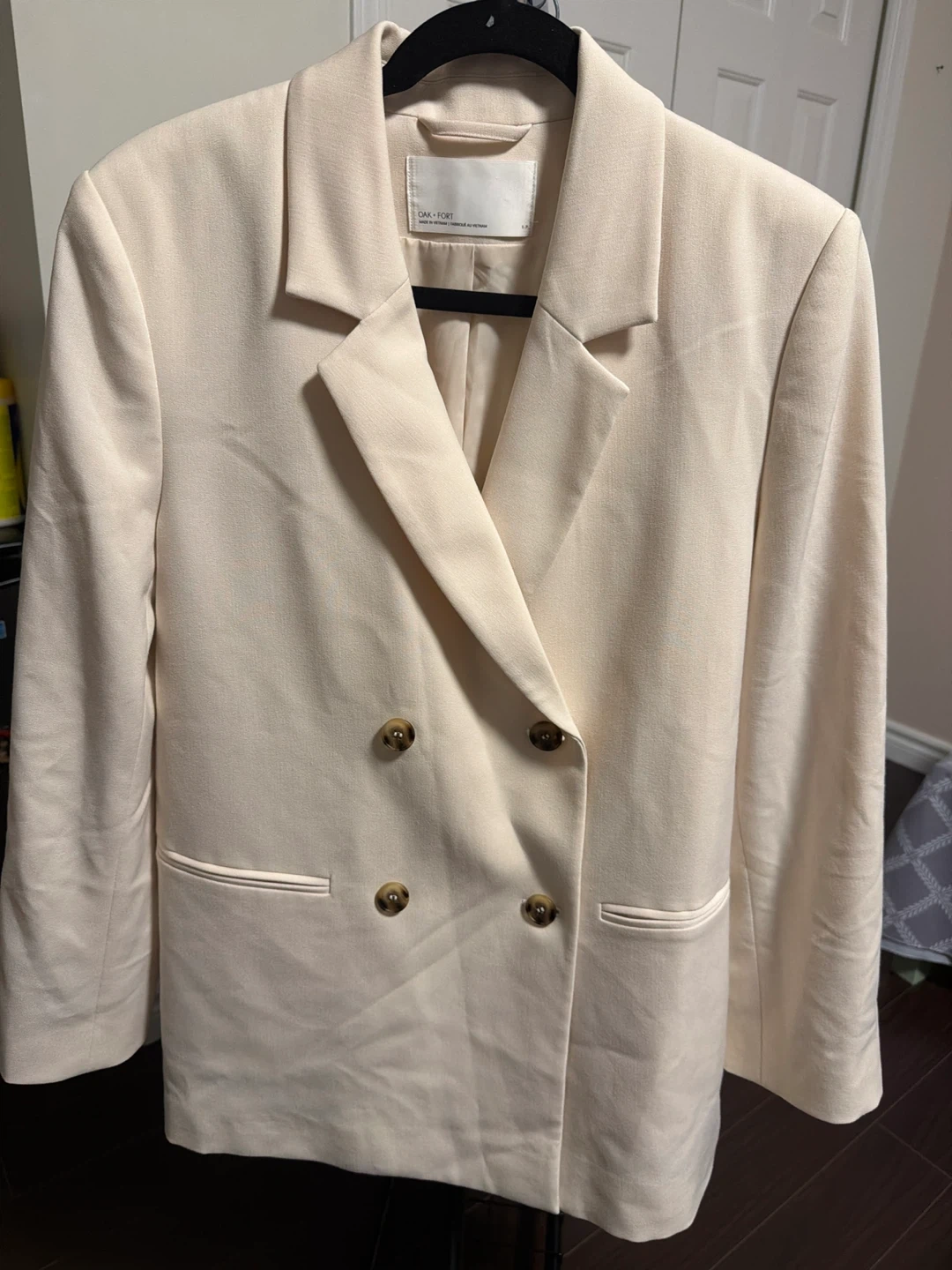 This is an OAK + FORT double-breasted blazer in a light cream colour. It features four buttons and two front pockets. The material is a polyester blend.