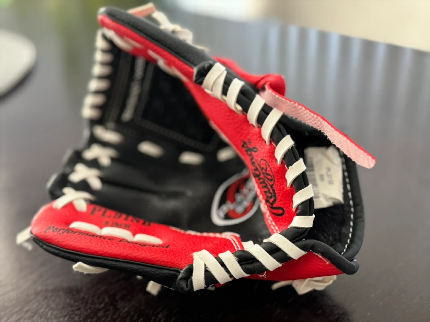 A Rawlings baseball glove in black and red. It's a youth 9 inch glove. Suitable for young baseball players.