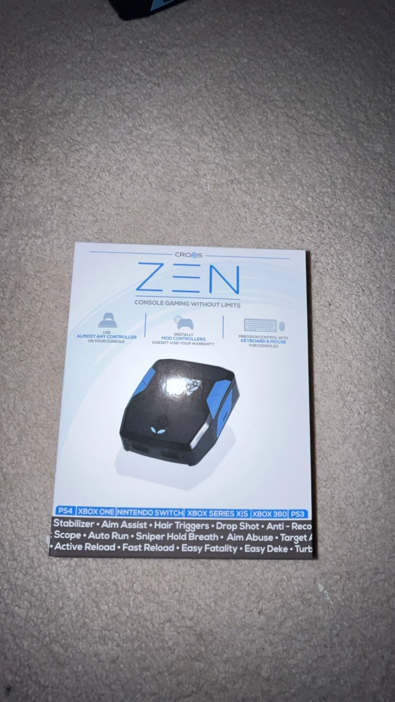 This Cronus Zen adapter is designed for console gaming without limits. It's compatible with PS4, Xbox One, Nintendo Switch, Xbox Series X|S, Xbox 360, and PS3. The device offers features like Stabilizer, Aim Assist, and Auto Run. Includes original box and cables.