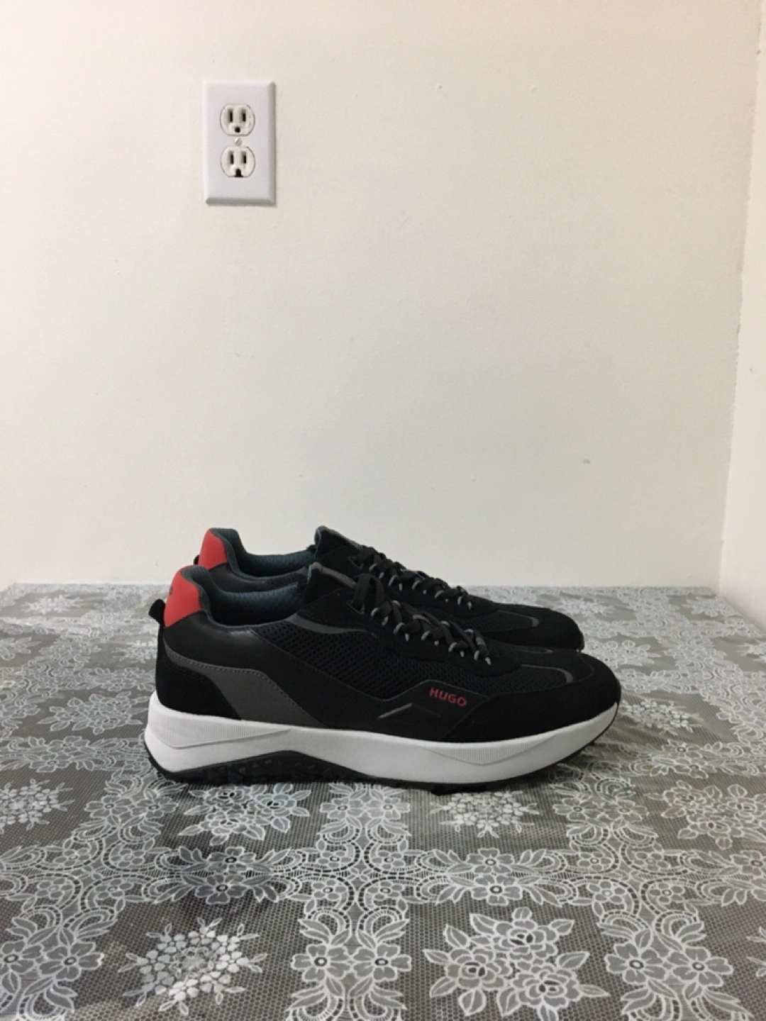 Hugo Boss men's sneakers in black. Features red accents on the heel tab. Lace-up closure with a durable rubber sole. These are great for casual wear! Pick up at steeles and Bathurst cash only