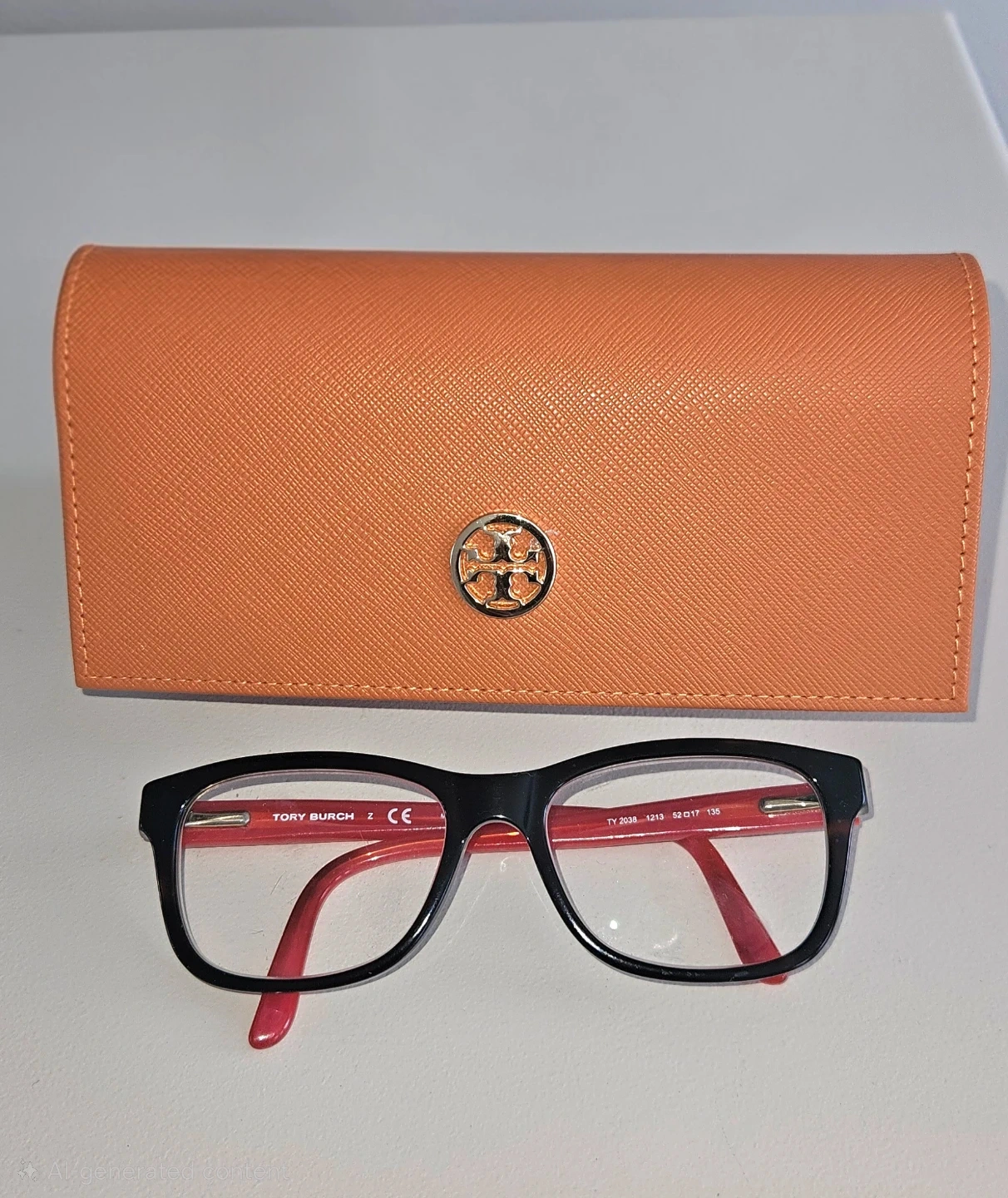 Used Tory Burch eyeglasses with a black frame and red arms. Includes original orange case. Model: TY 3004-L 1213 52. Lens width 52mm, bridge 17mm, temple length 135mm. Frame is in very good condition.