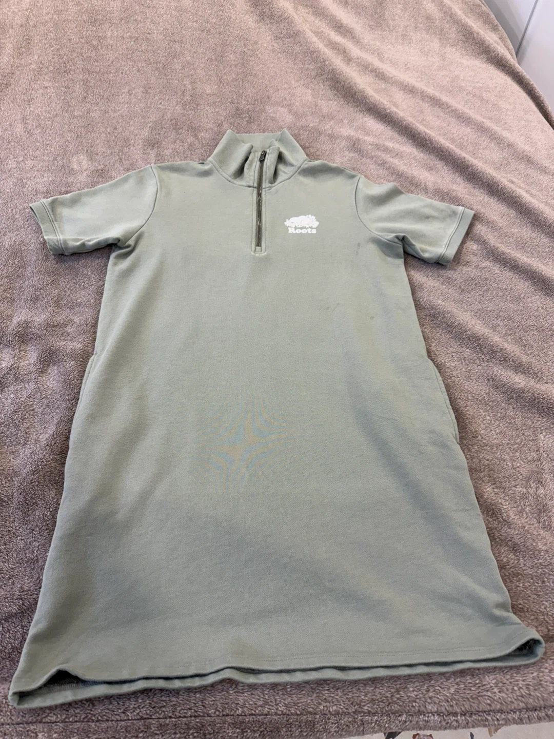 A Roots quarter zip sweatshirt dress in a light green colour. It features short sleeves and a high collar with a zip closure. Made from a comfortable, soft material. This dress is size S/P.