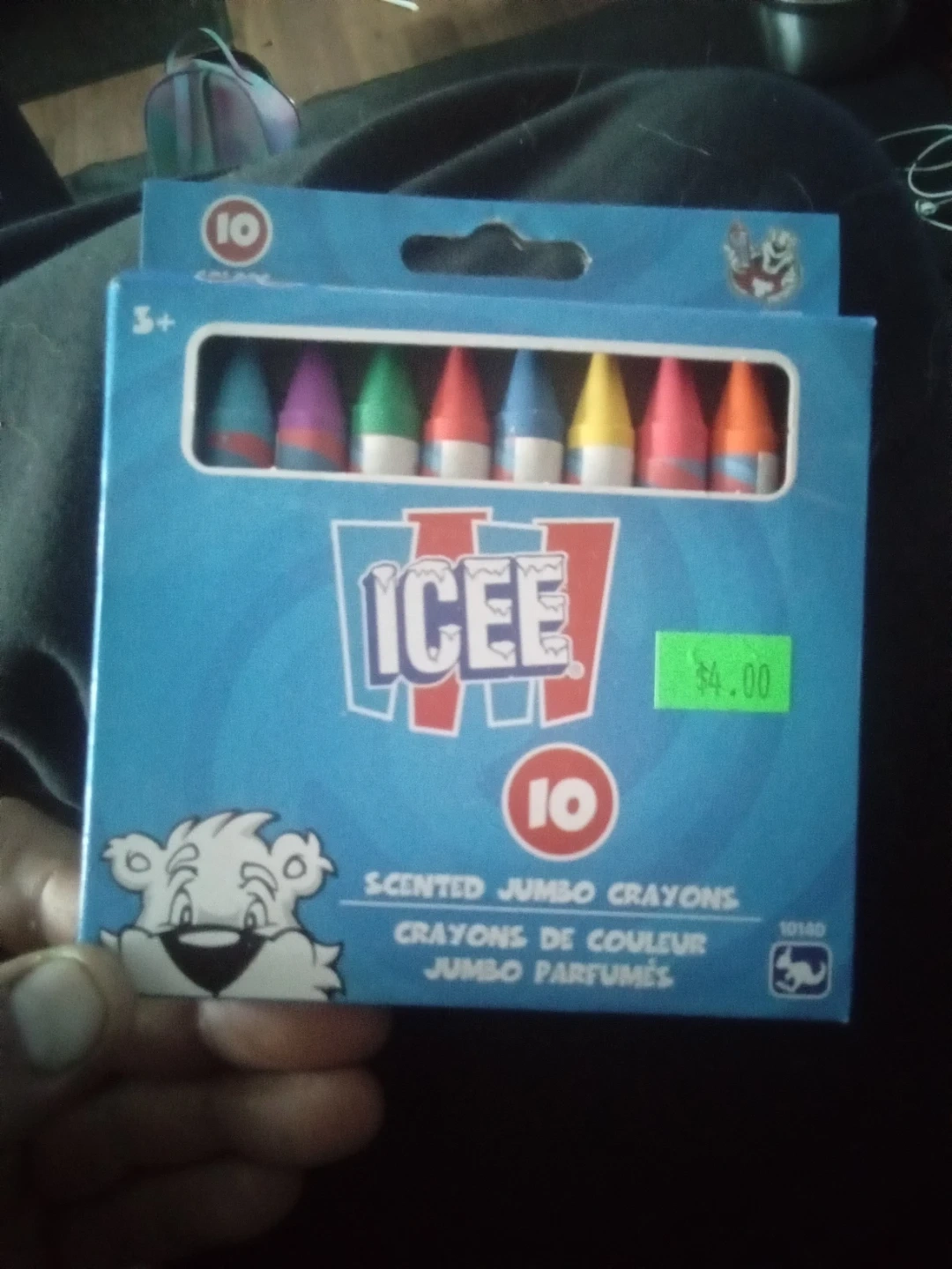 ICEE scented jumbo crayons, 10 pack. For ages 3 and up. These jumbo crayons are scented and come in assorted colours.