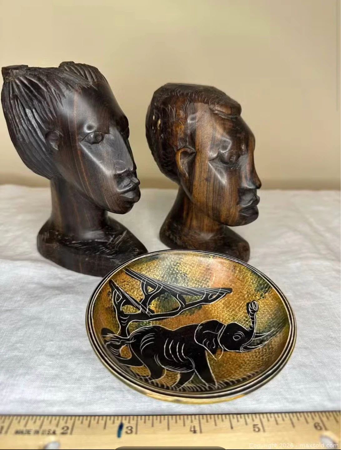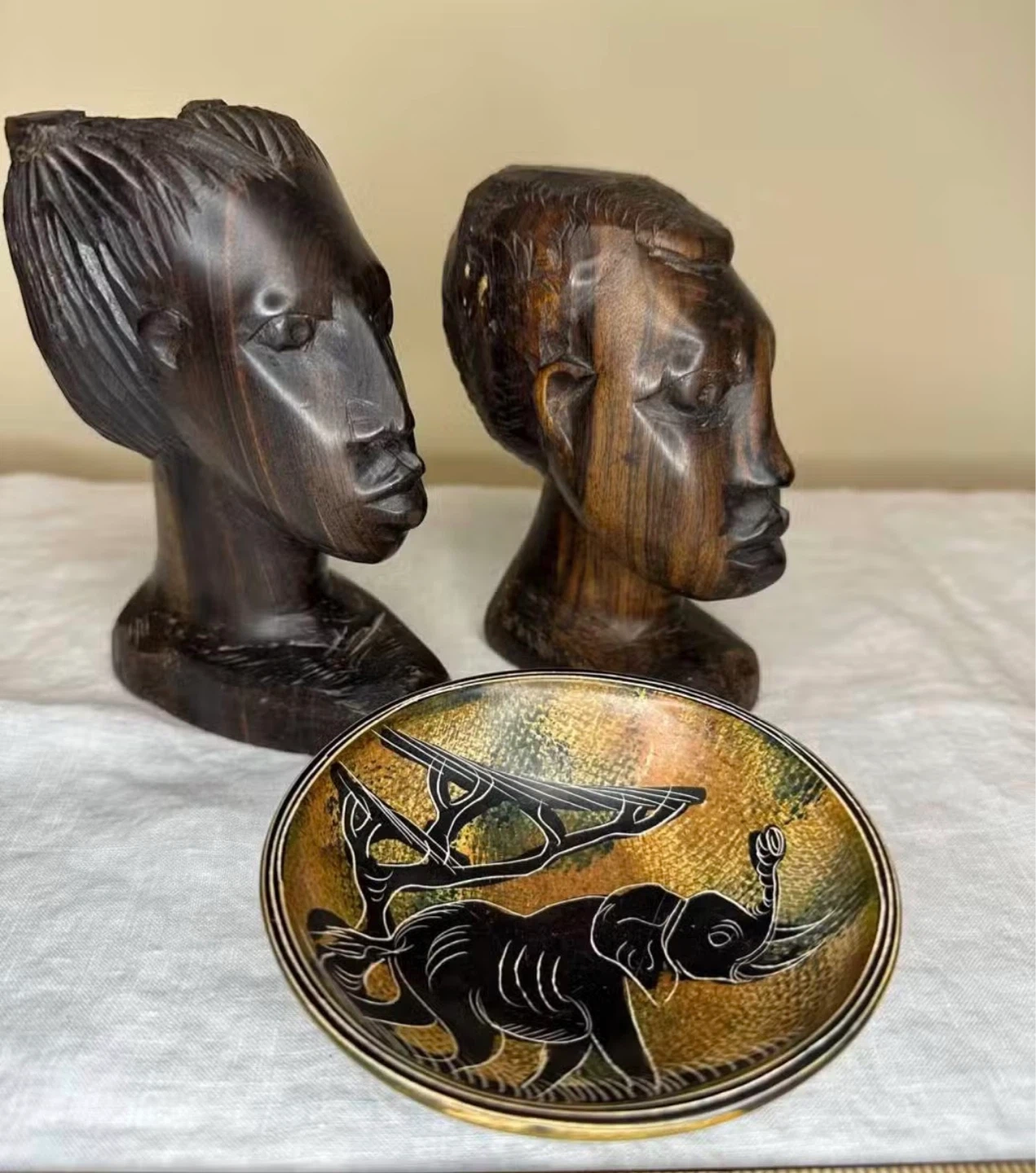 This set includes two hand-carved wooden busts of African figures and a decorative dish featuring an elephant and tree motif. The dish has a colourful, textured interior with a black carved design. Great for display!