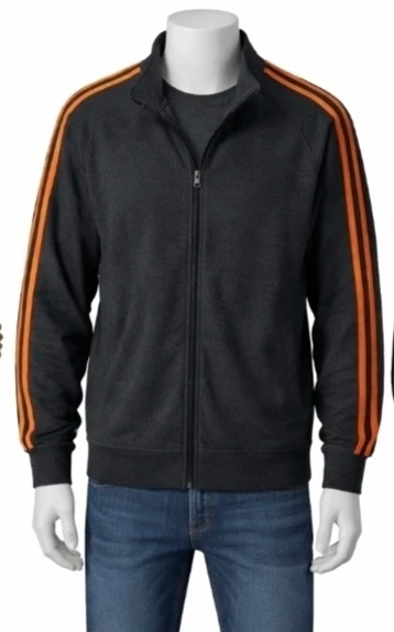 Light zip-up sweater with a two-toned design color design. Primary color dark gray, accent color orange.