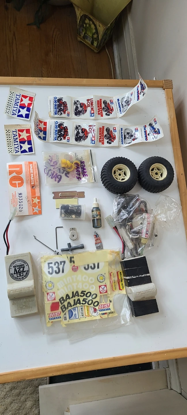 A bunch of 1980s TAMIYA parts for Remote Control Cars.