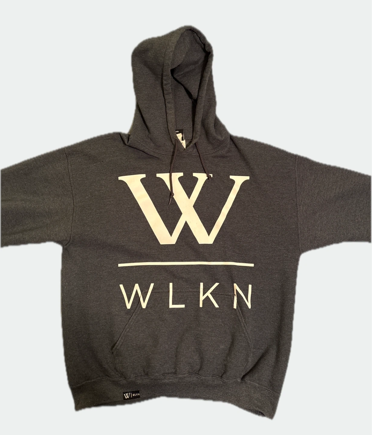 This is a WLKN brand grey hoodie. It's a pullover style with a front pocket and hood. It has a large 'W' logo on the front with 'WLKN' below it.