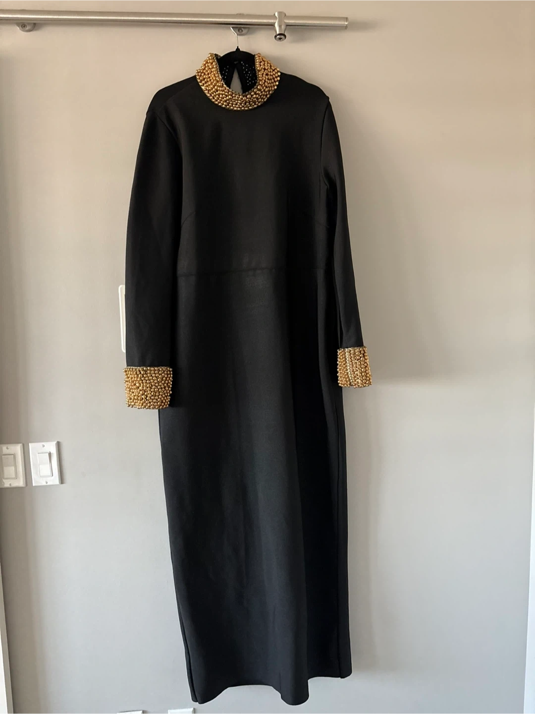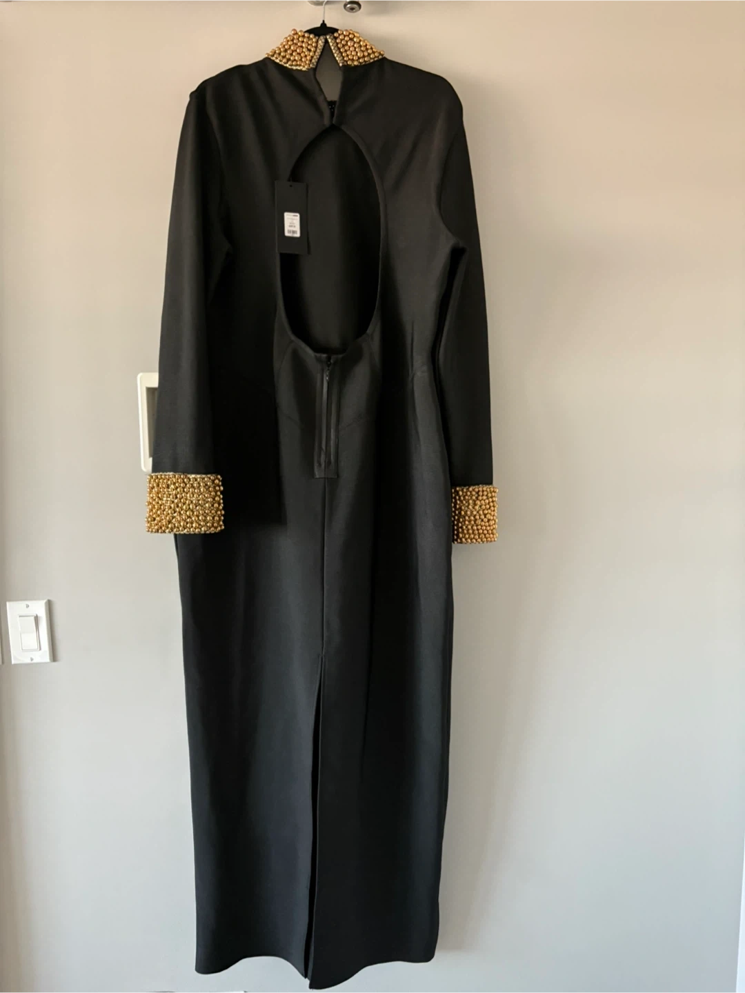 Elegant black Fashionova maxi dress featuring a high neckline and cuffs embellished with gold beads. It has a dramatic open back with a zipper closure and a subtle slit at the hem. Made from a comfortable stretch fabric. Size is 3X and brand new never been worn