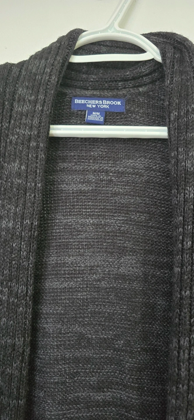 This is a dark grey marled knit cardigan from Beechers Brook New York. It features a shawl collar and decorative buttons at the waist. M/M size.