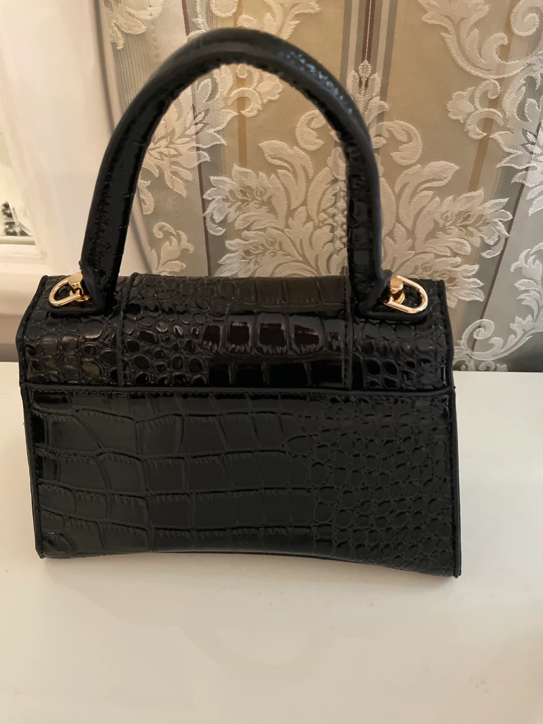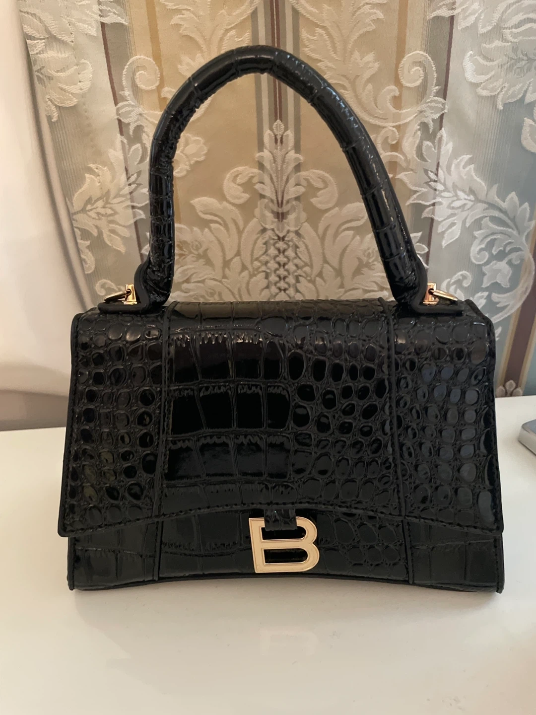 Black Crocodile Embossed Handbag with Gold 'B' Logo