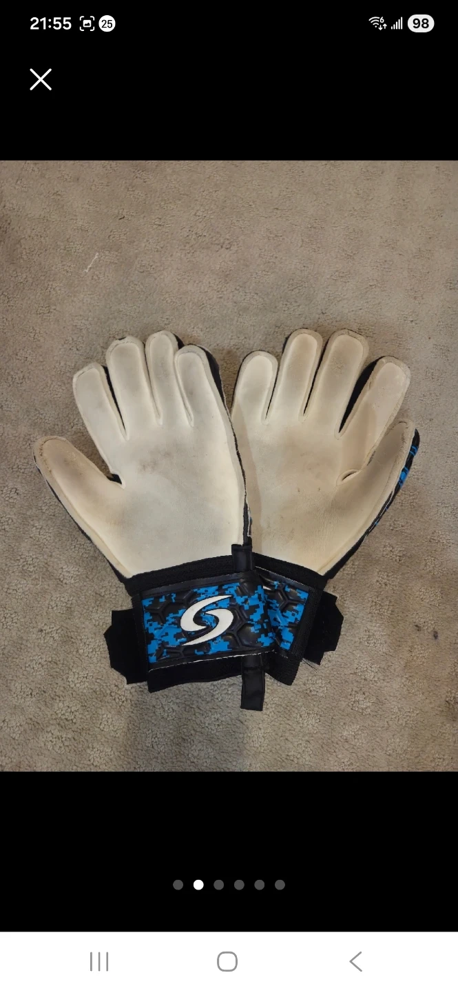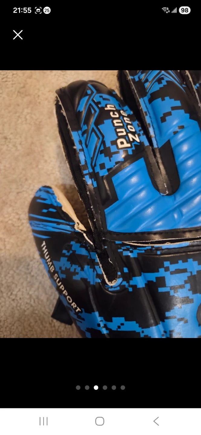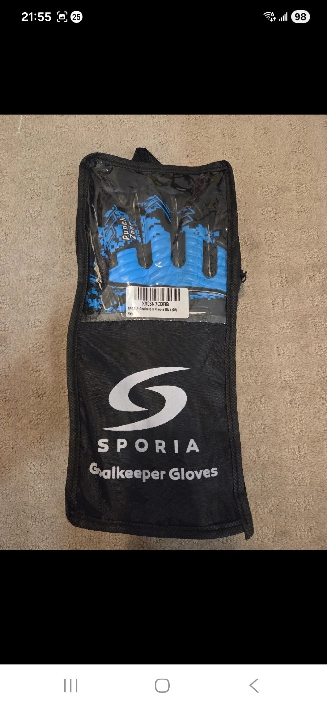 Selling a pair of Sporia Goalkeeper Gloves in blue. They feature punch zone and thumb support. Comes with glove bag. It fits mostly anyone, specifically teenagers. It only has minor scratches on the front but won't affect gameplay. Barely used.