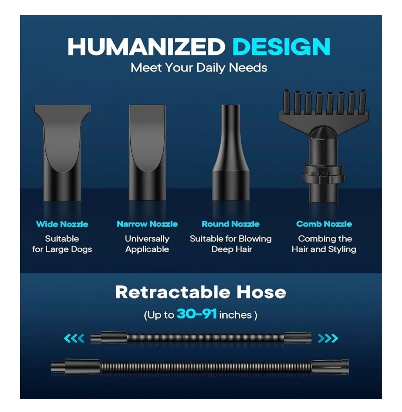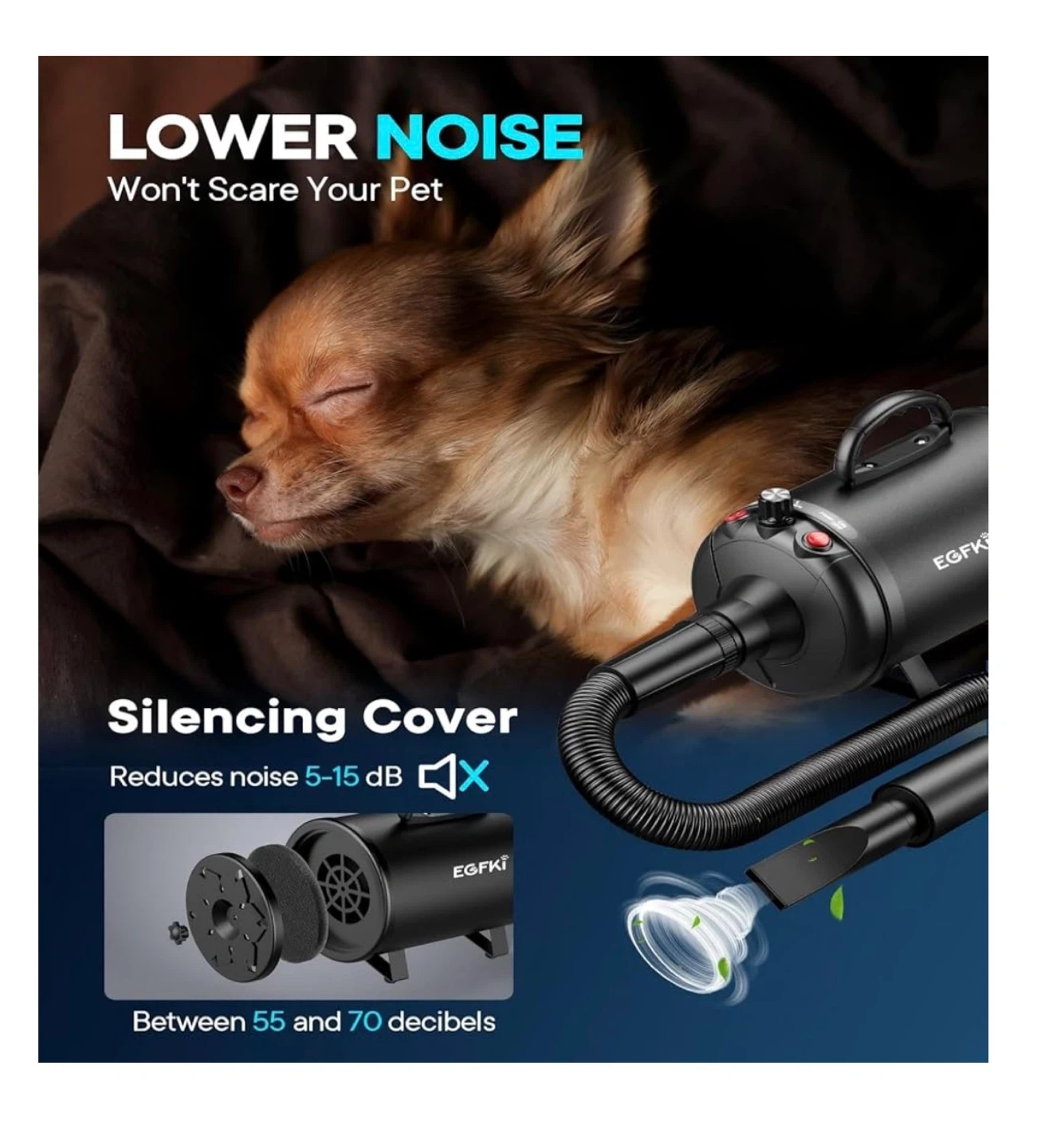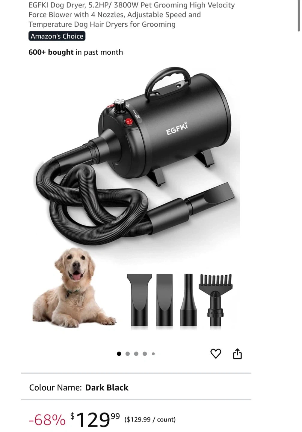 This EGFKI dog dryer is a high-velocity force blower with adjustable speed and temperature. It comes with 4 nozzles for grooming different coat types. It's designed to be lower noise so it won't scare your pet. The hose is retractable from 30-91 inches. Originally bought for $129.99