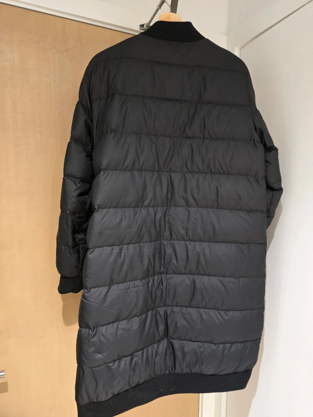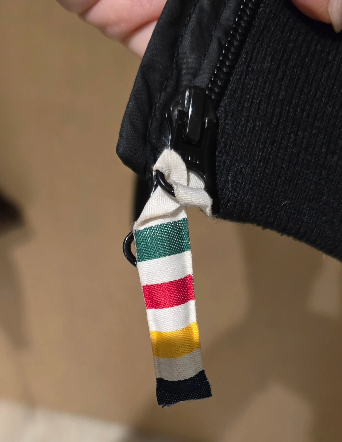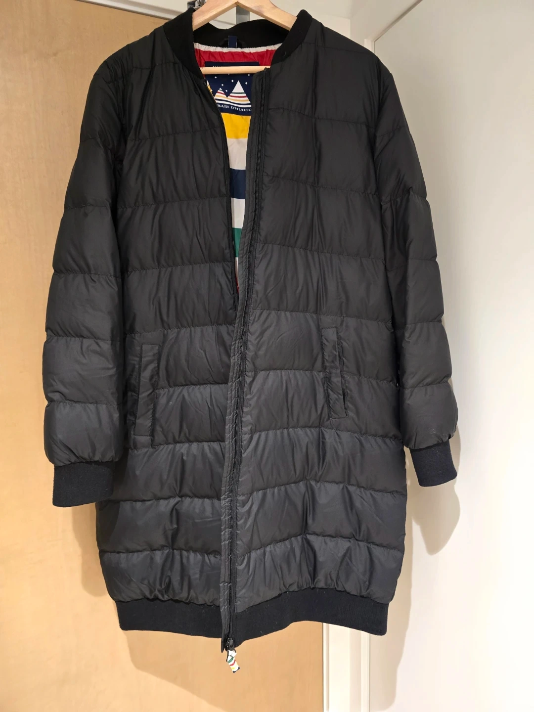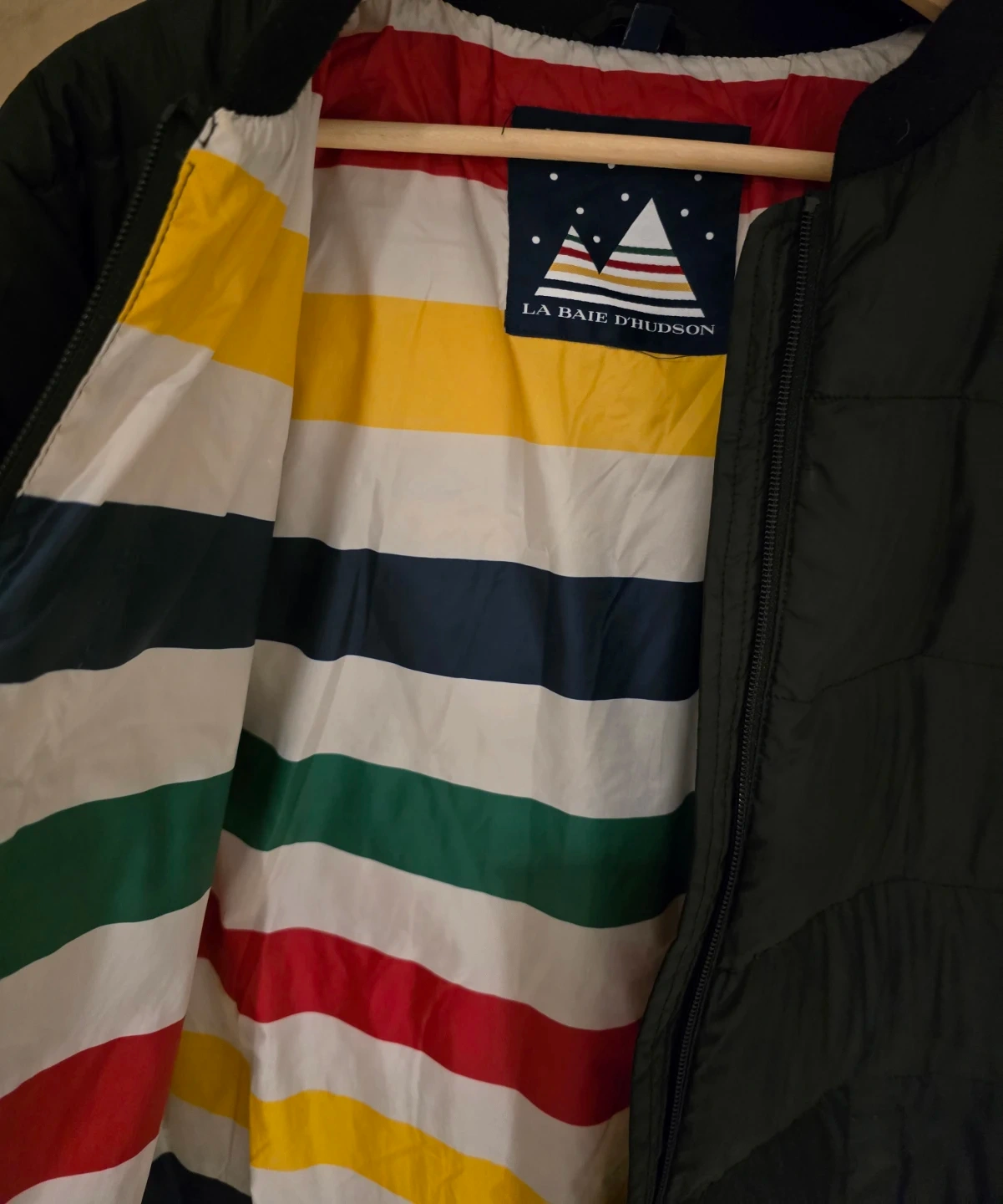 Black puffer jacket with the iconic La Baie d'Hudson stripe lining, cute zipper detail.