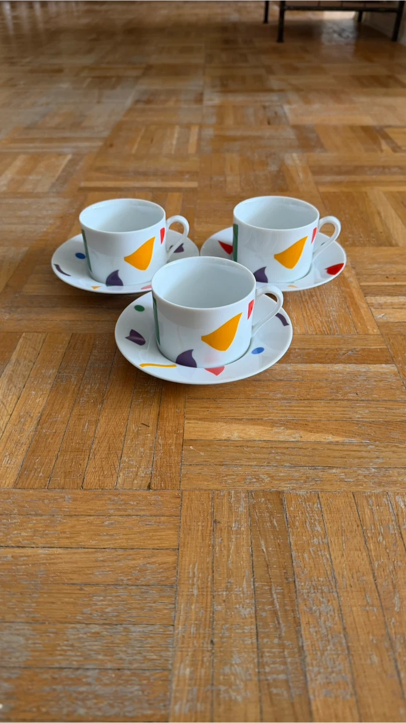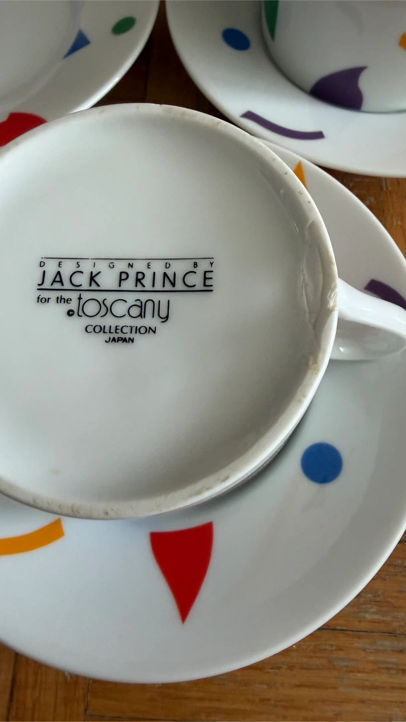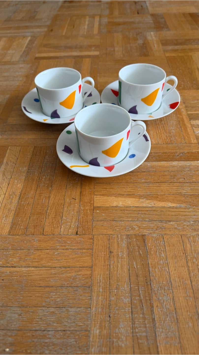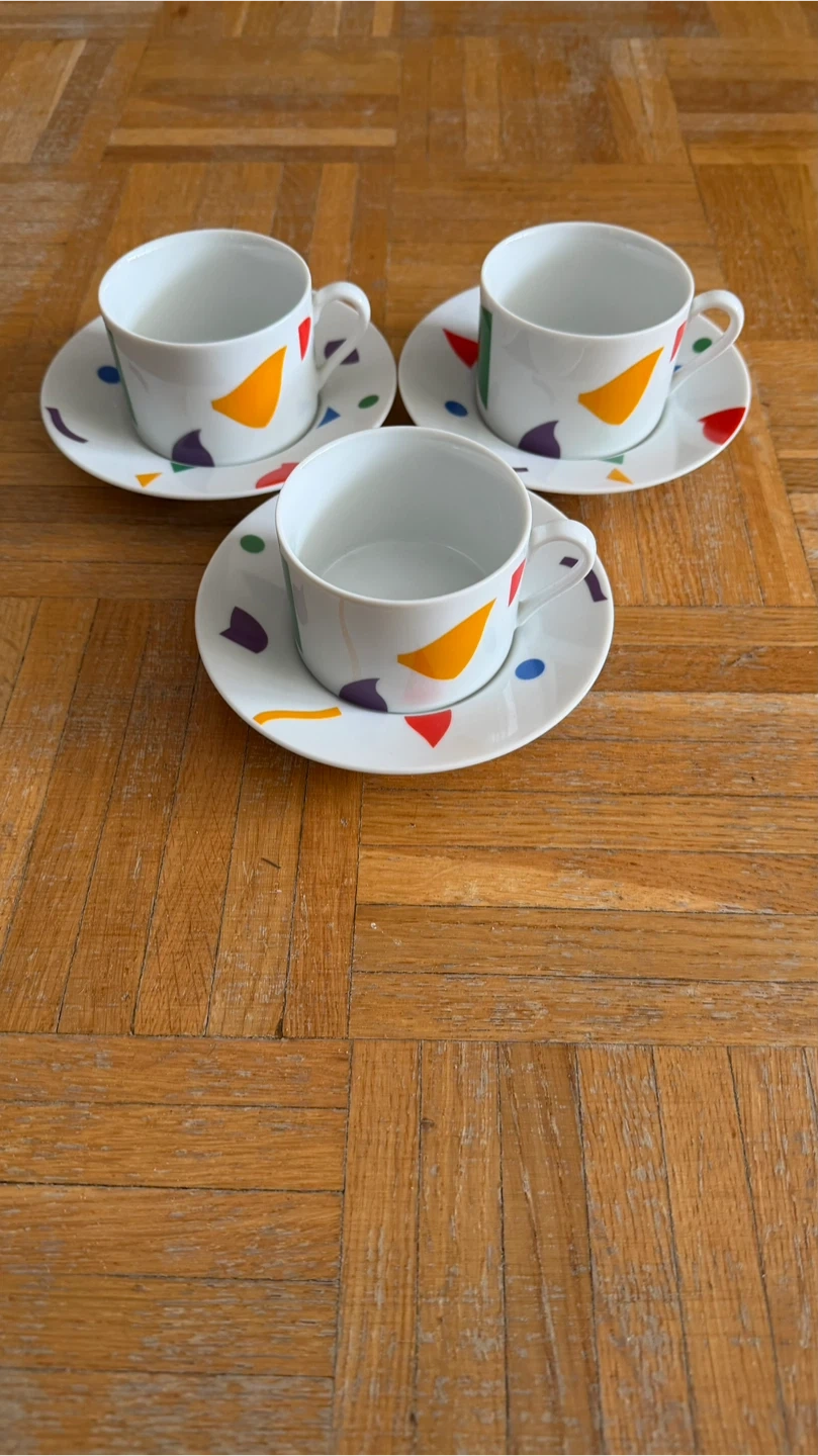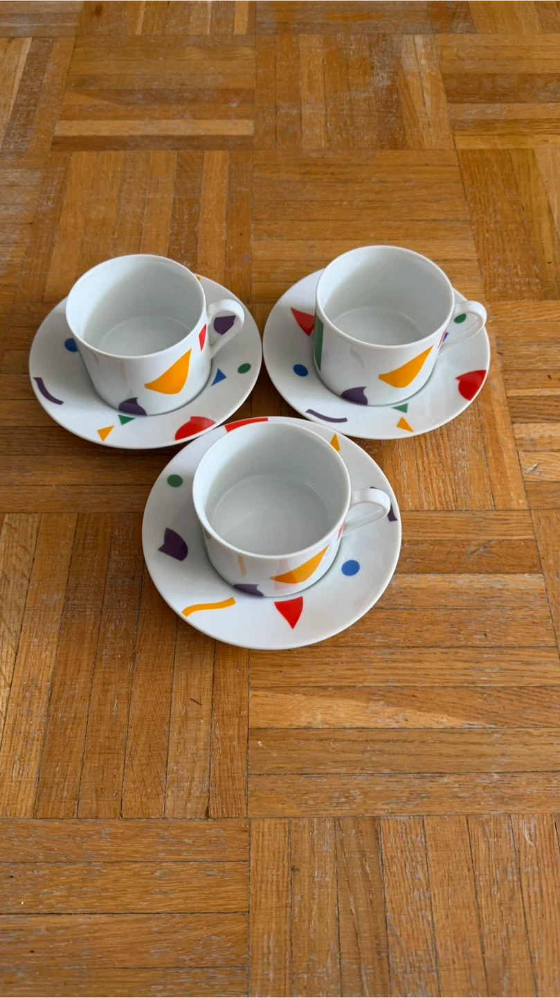 Set of three coffee cups and saucers designed by Jack Prince for the Tuscany Collection. Made in Japan. White ceramic with colourful geometric pattern.