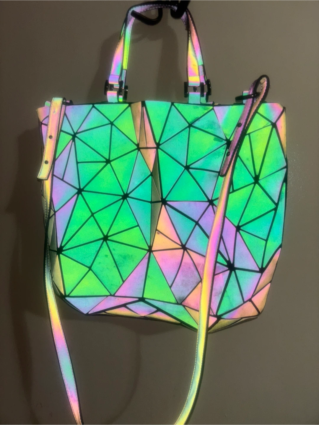 This tote bag features a unique geometric prism design that reflects light in various colours. It has two top handles and an adjustable shoulder strap. The interior has a zip pocket.