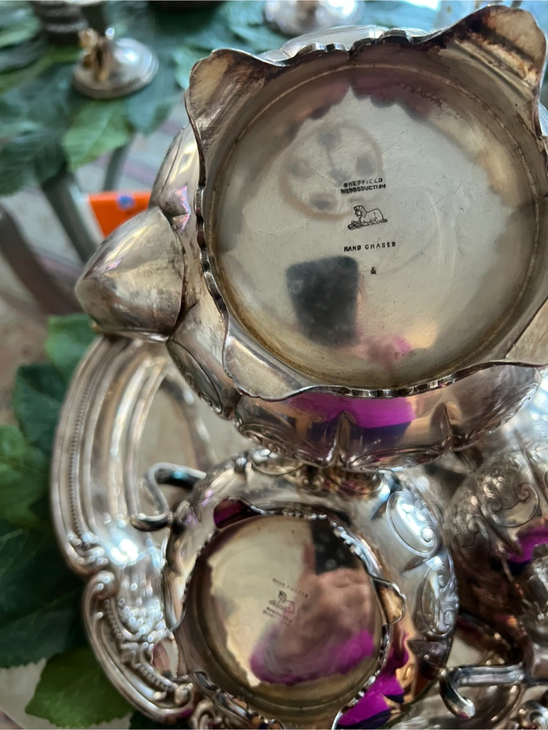 Elegant four-piece silver-plated tea set featuring ornate detailing and a dark wood handle on the teapot. Set includes a teapot, sugar bowl, creamer, and serving tray. This classic set adds a touch of vintage charm to any occasion.