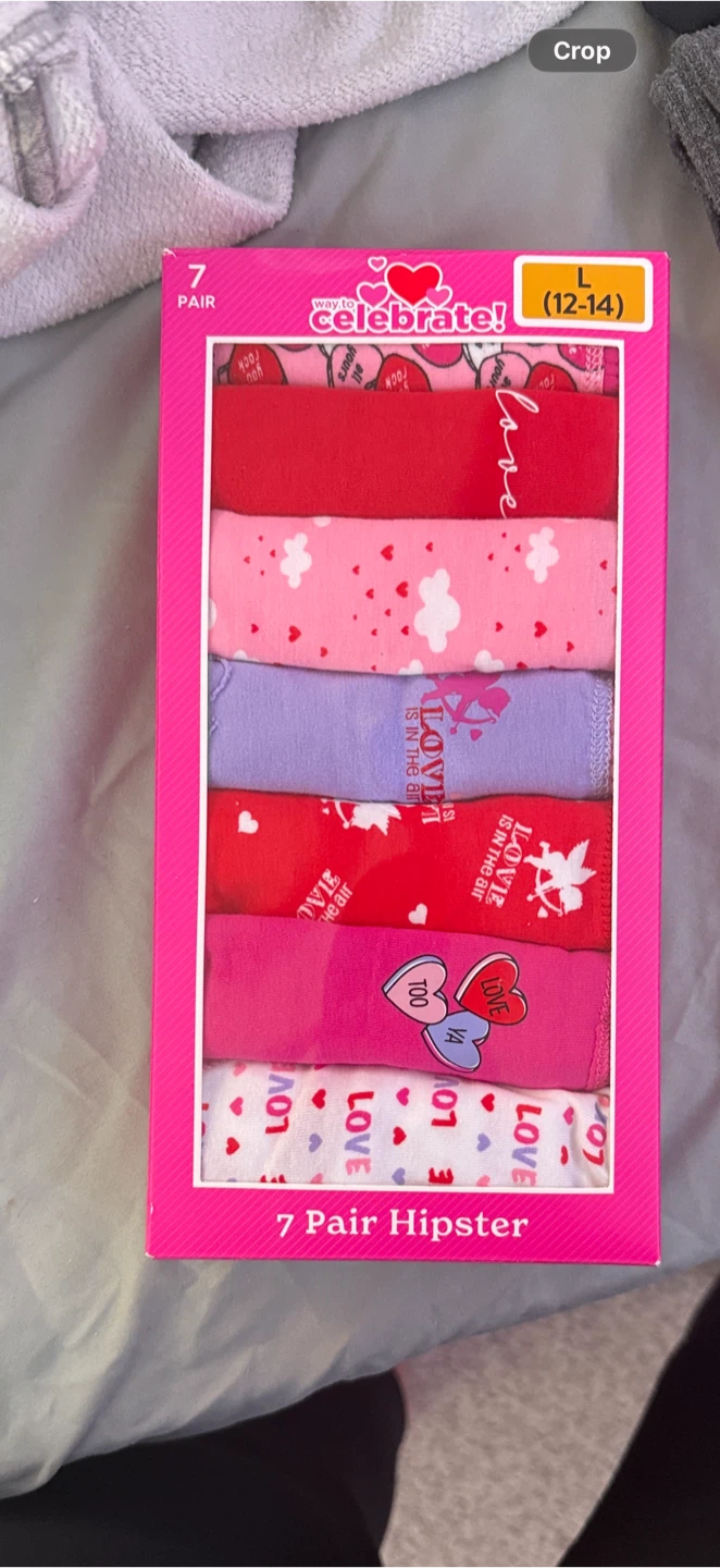 This pack includes 7 pairs of Way to Celebrate! hipster underwear. The multipack features various Valentine's Day-themed designs. Available in size L (12-14).