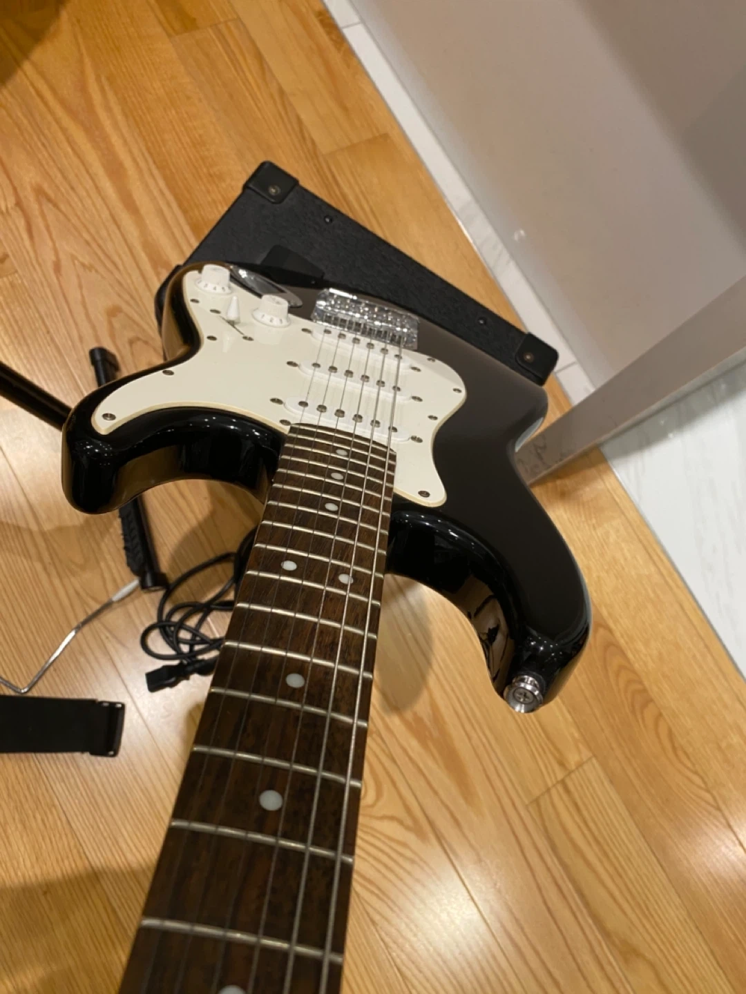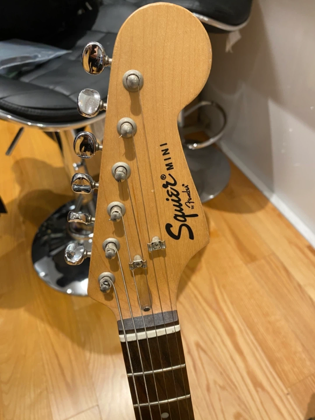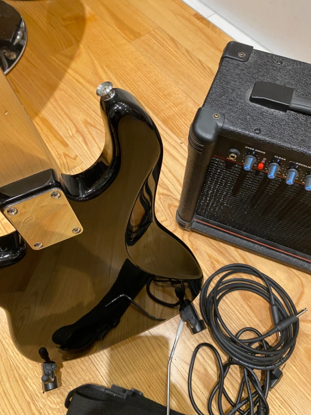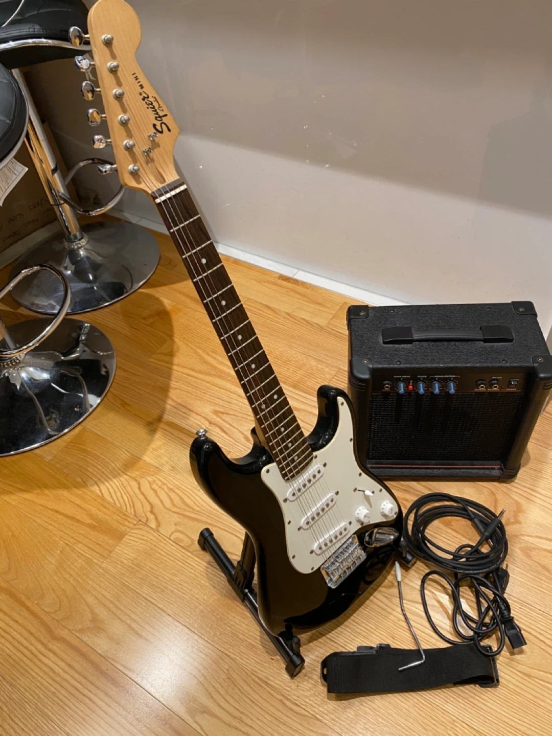 Selling my son Mini Squier by Fender electric guitar and Amplifier 15W in excellent condition. Very well taken care. Easy to play and has a beautiful sound. Good quality brand. Come with cable cord. Strap. Stand. Whammy bar and Picks. Ready to play. Asking 380$ . CASH only. No delivery. No trade. Thanks