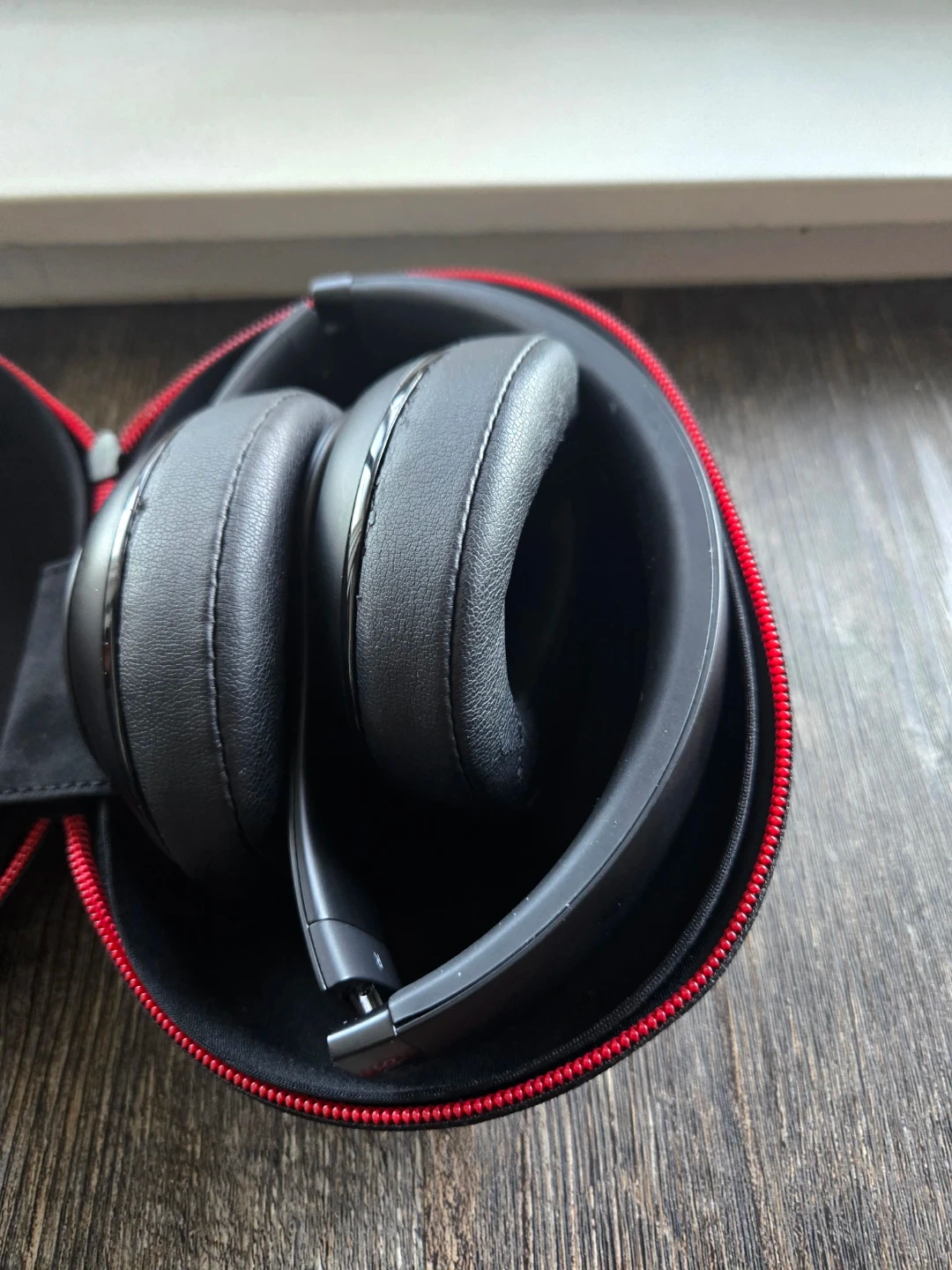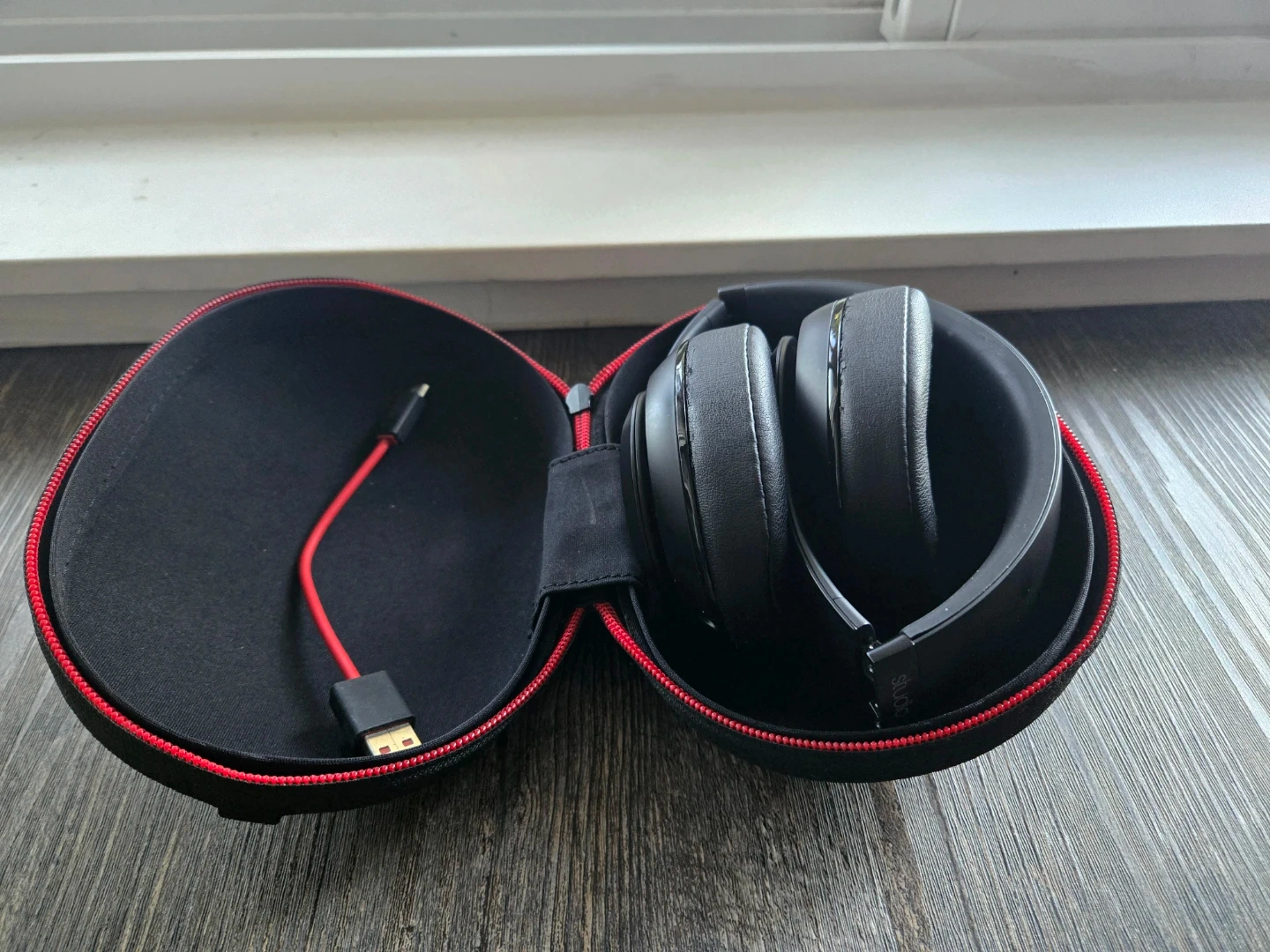 Black Beats Solo HD on-ear headphones. Includes a protective carrying case and charging cable. Works great!