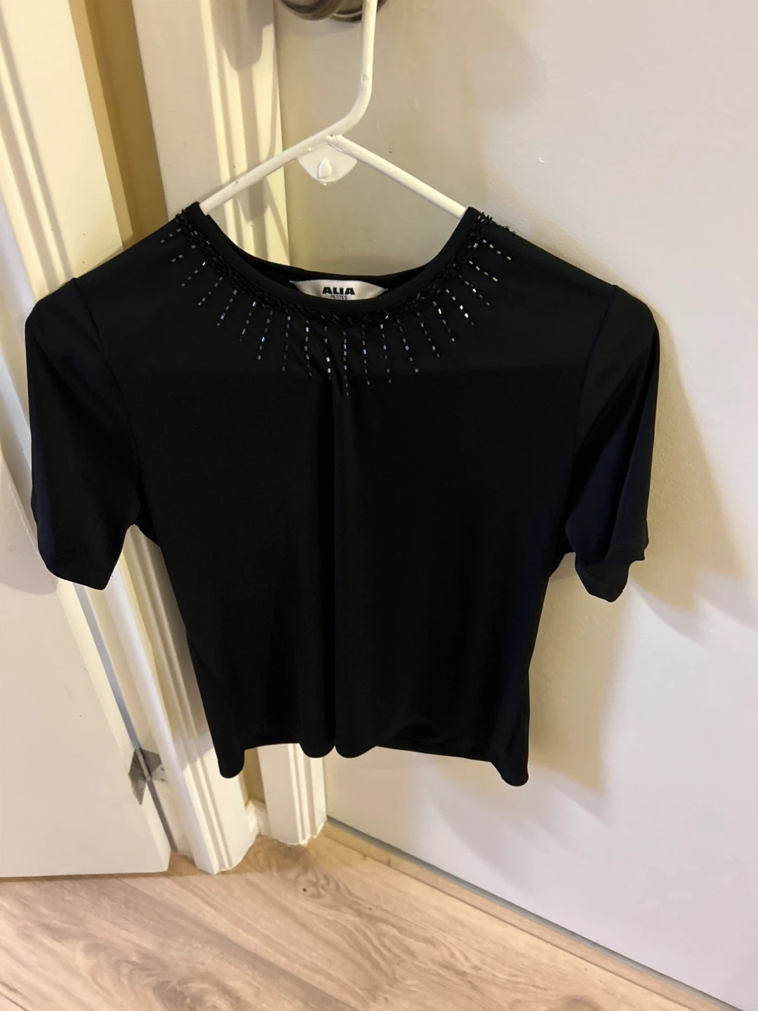 This Alia Petites top is black and features a beaded neckline for a touch of sparkle. It's a short-sleeved style, perfect for layering or wearing on its own. This top would be a great addition to a casual or dressy outfit!