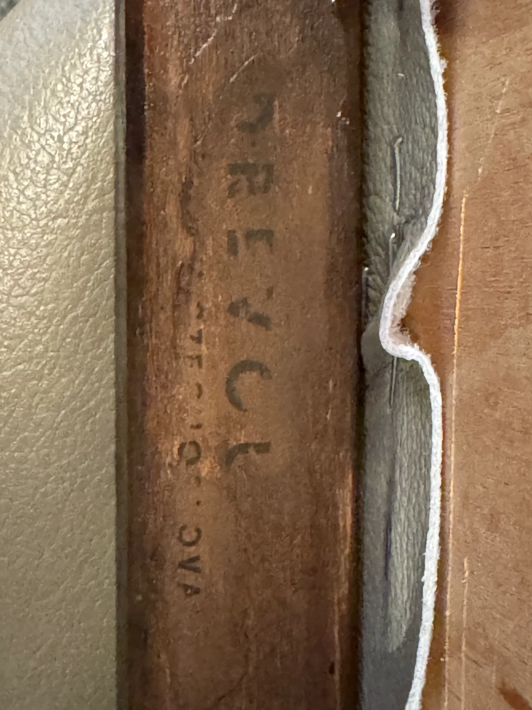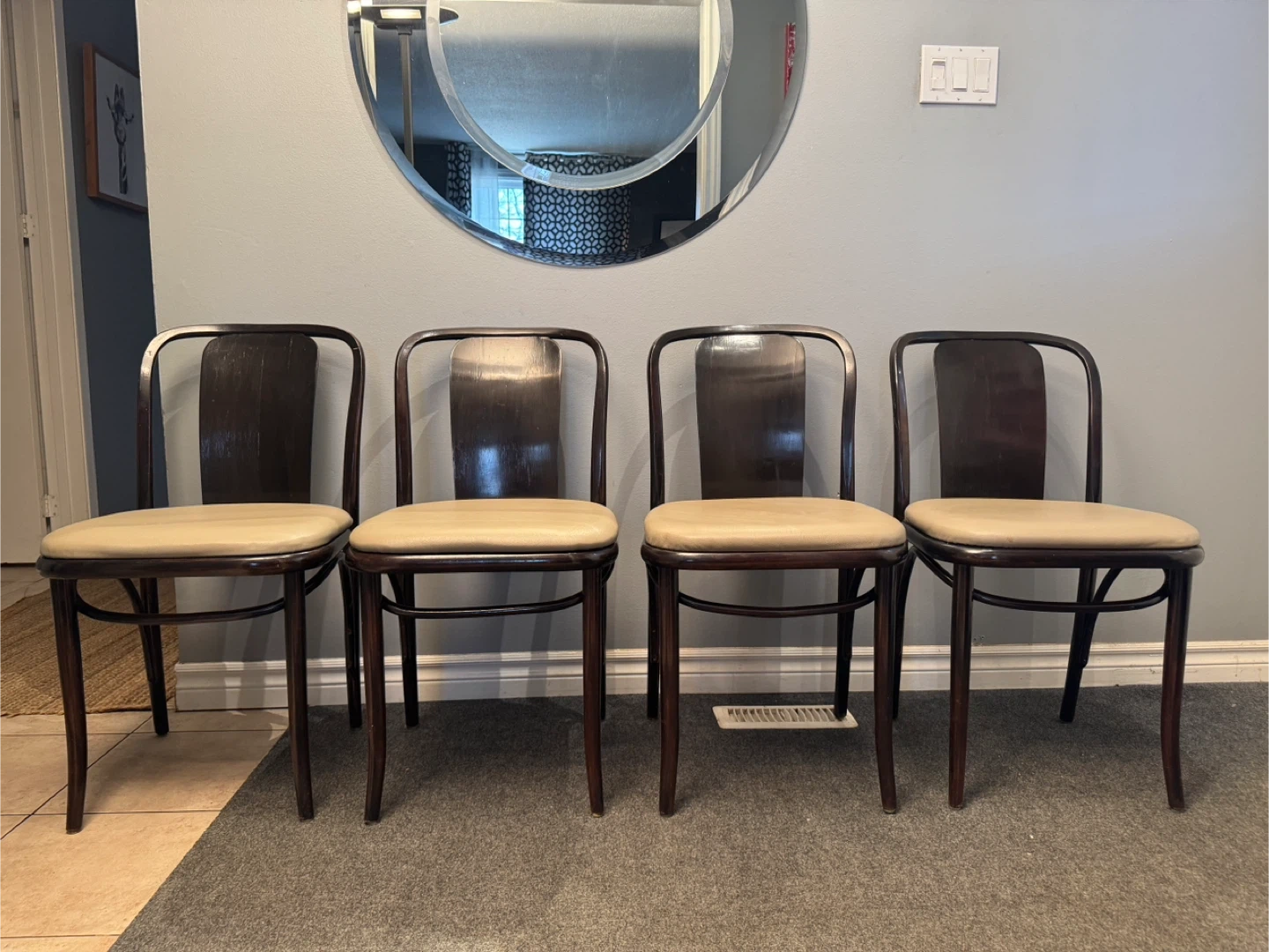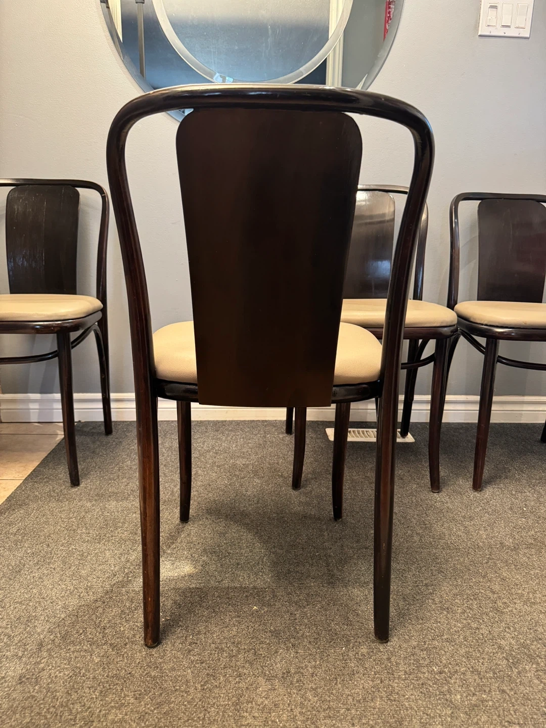 Set of six chairs with dark bentwood frames and light beige upholstered seats. These chairs have a classic, elegant design. They're great for a dining room or accent seating. Wood frames and fabric seats.