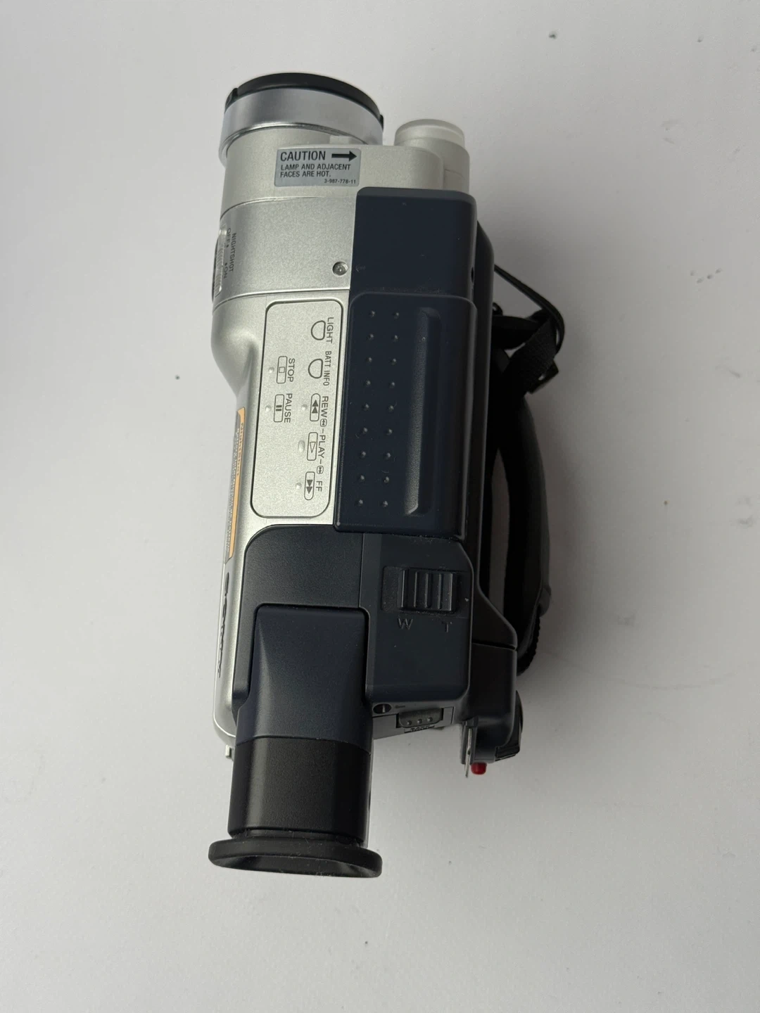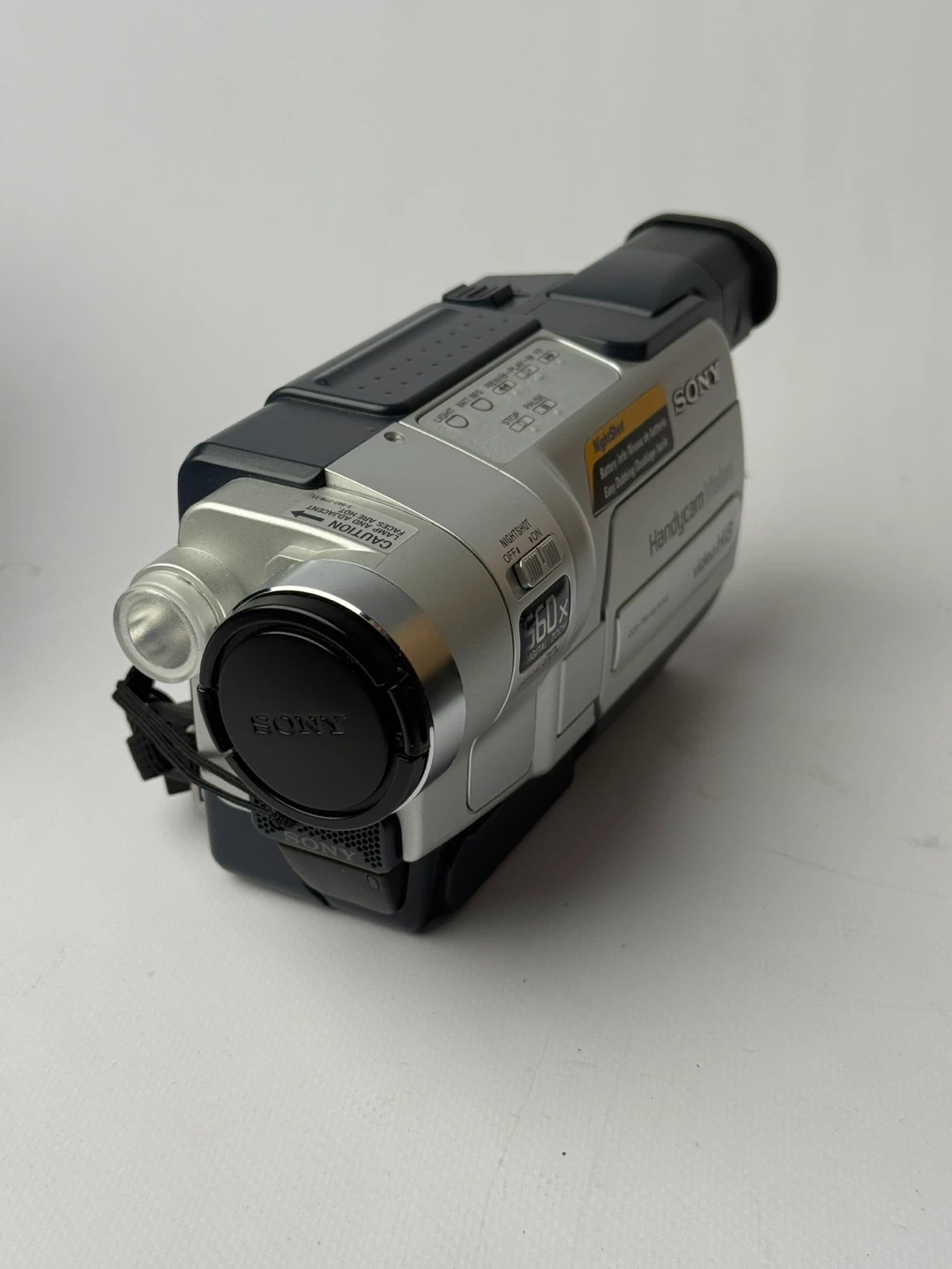 This Sony Handycam Hi8 video camera recorder is silver and dark grey. It features NightShot capability and 360x zoom. Perfect for capturing memories!