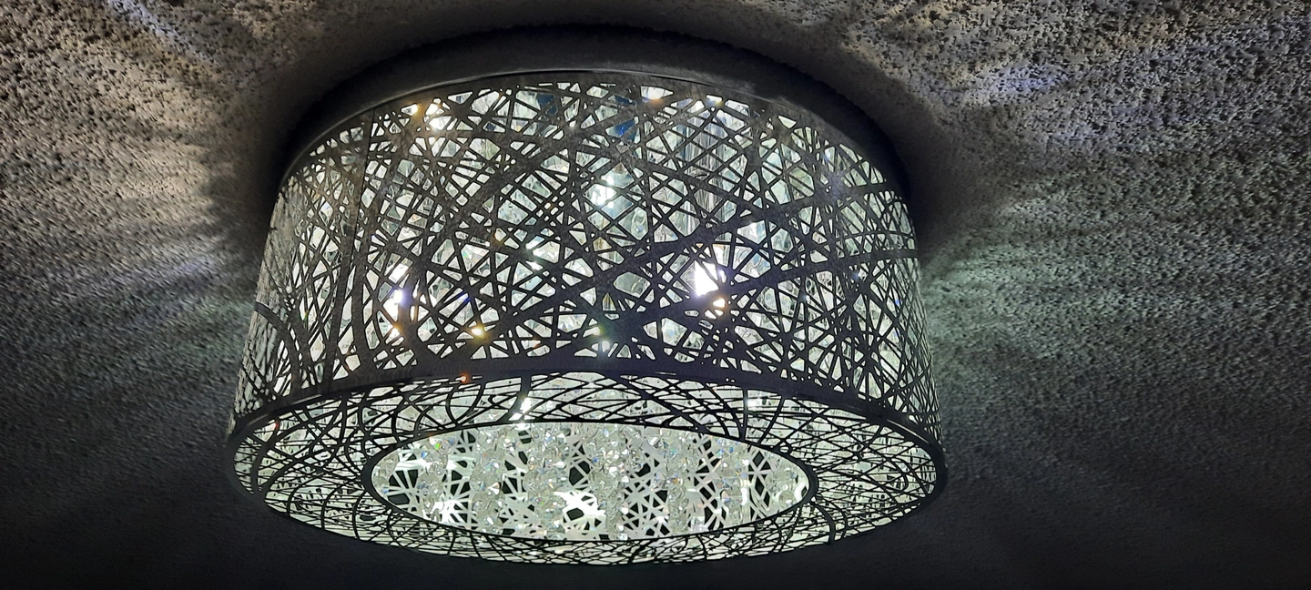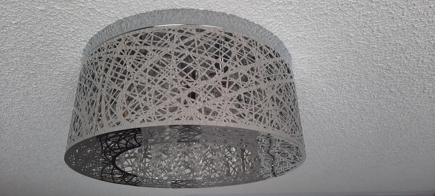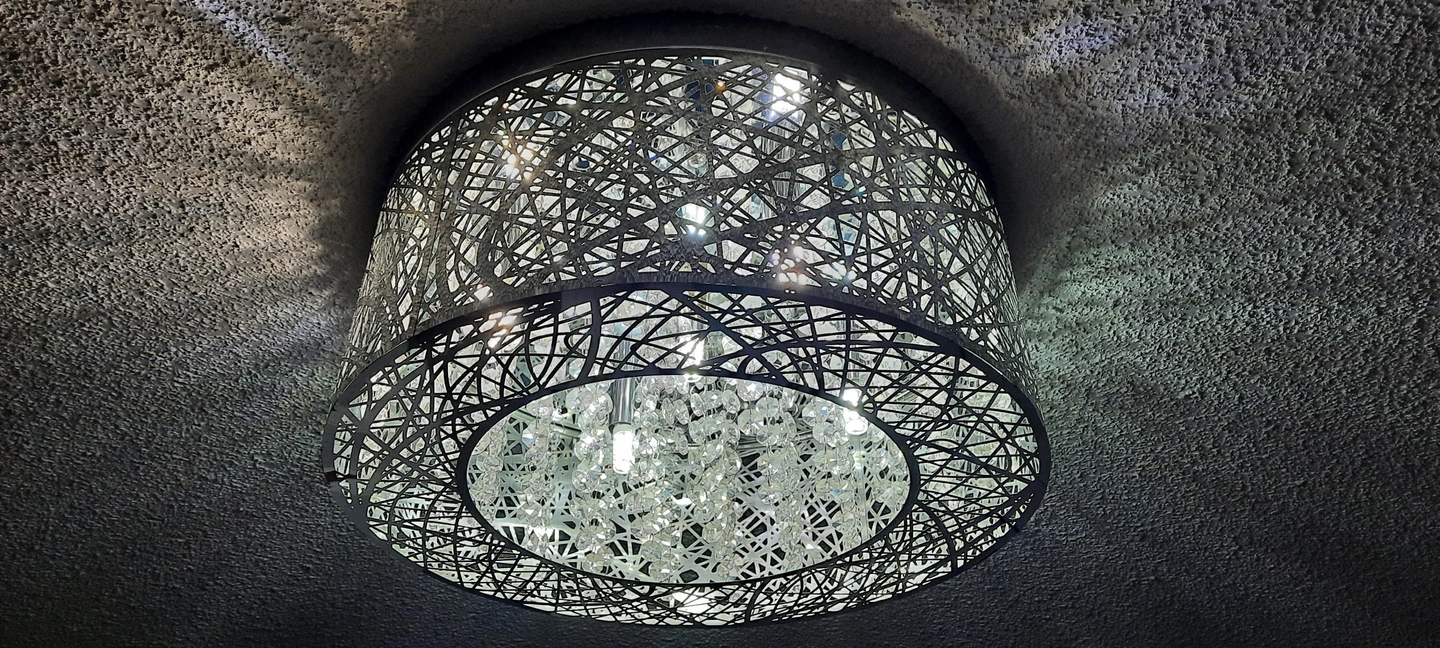 The laser cut stainless steel mirror shade features a unique design and pairs with crystal pendants for added luxury.