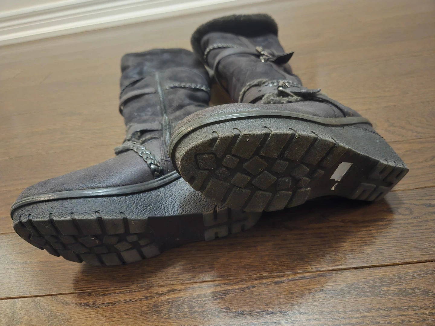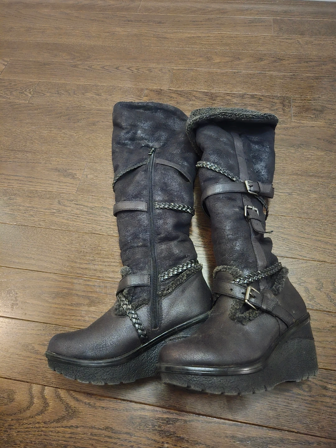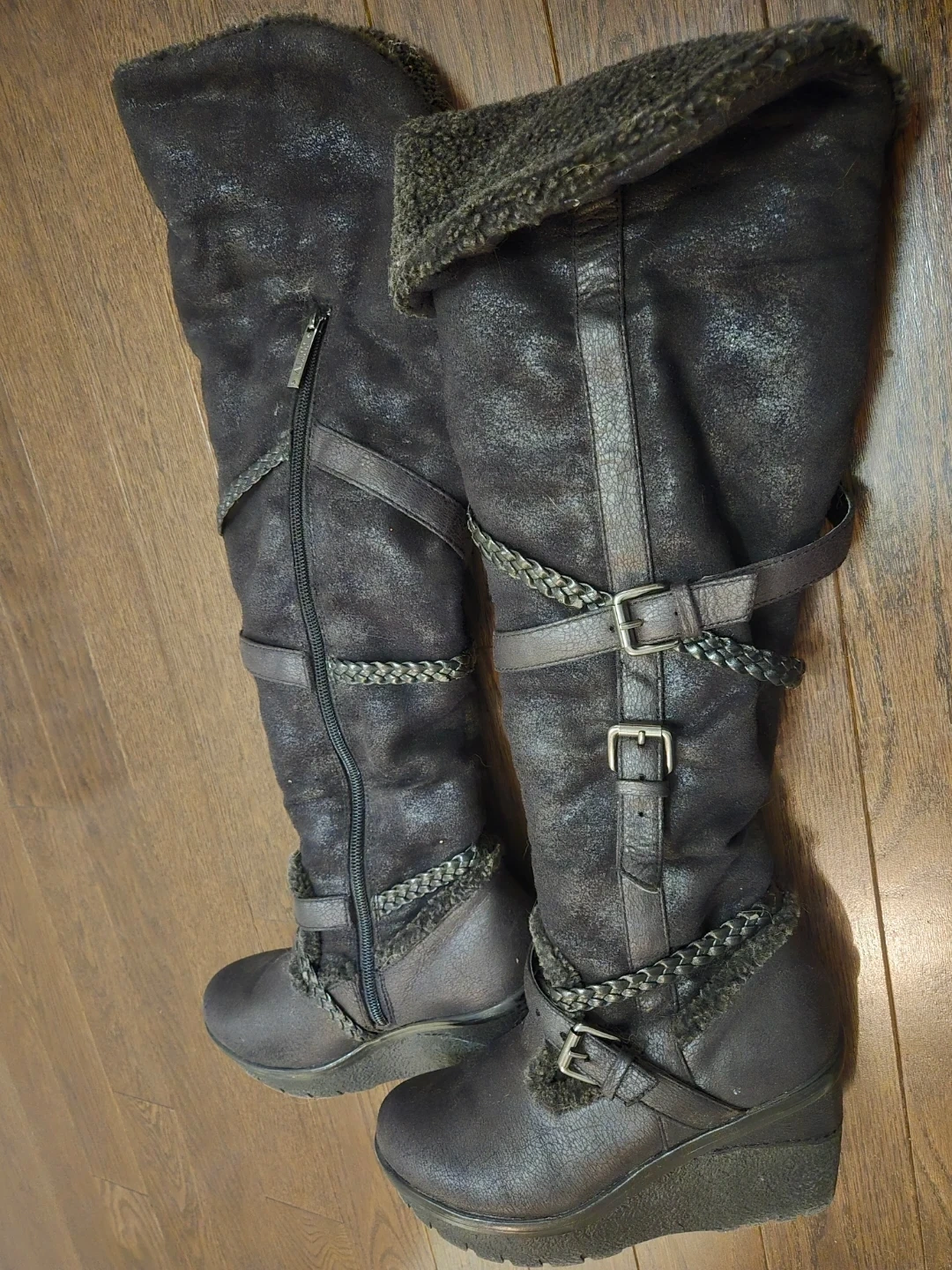 They feature braided detailing, buckles, and a cozy faux fur lining at the top. Side zippers make them easy to put on. These boots are great for adding a fashionable touch to your winter outfits!