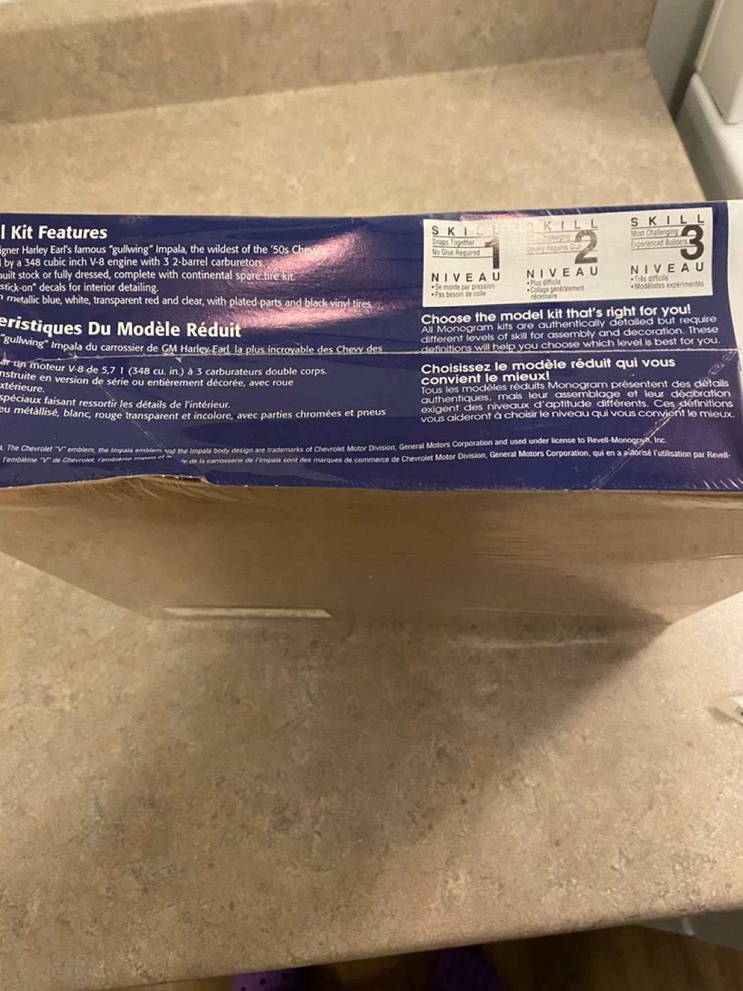 This is a Monogram model kit of a '59 Chevrolet Impala convertible. It features a highly detailed interior with a continental spare tire kit. The kit includes metallic blue, white, transparent red, and clear parts with plated parts and black vinyl tires. This model is skill level 2, requiring glue for assembly. Never opened packed in original box.