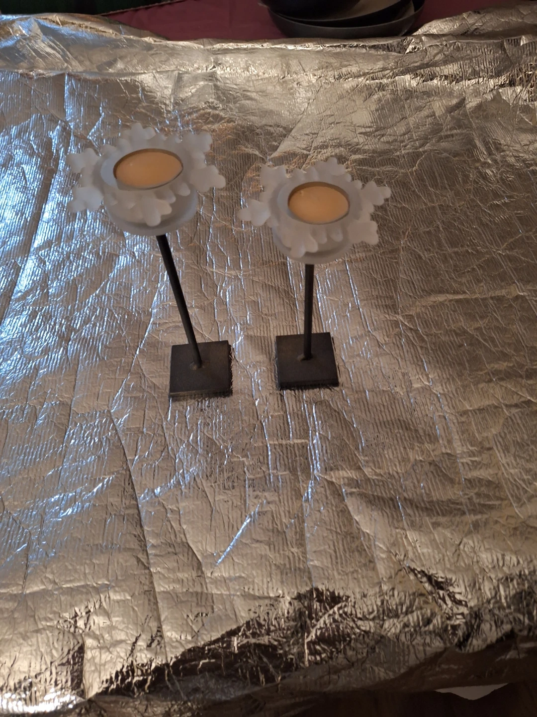 This set includes two unique tealight candle holders. Each holder features a snowflake-shaped frosted glass top on a dark metal stem and square base. They're perfect for adding a cozy ambiance to any room, especially during colder months!