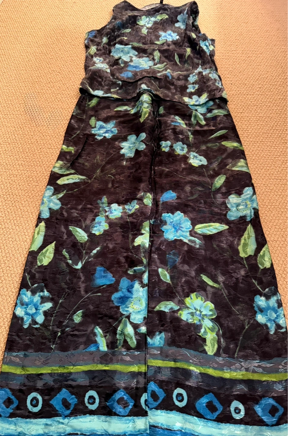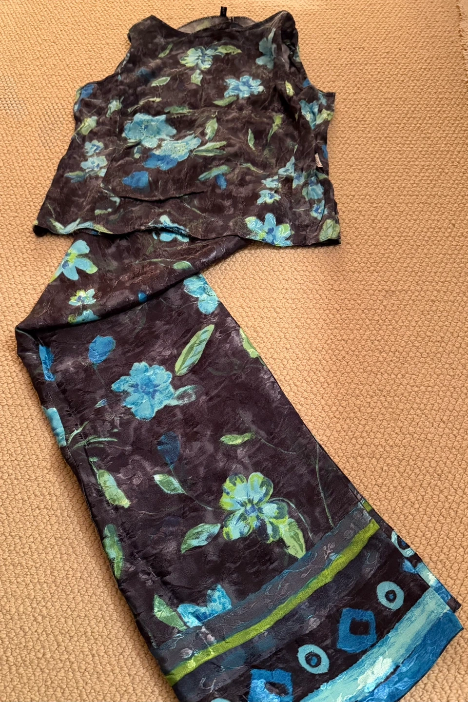 A stylish sleeveless top with a matching maxi skirt , both featuring a dark floral print with blue and green accents. This two-piece set is perfect for a casual outing or a relaxed evening. The fabric has a subtle textured shine.