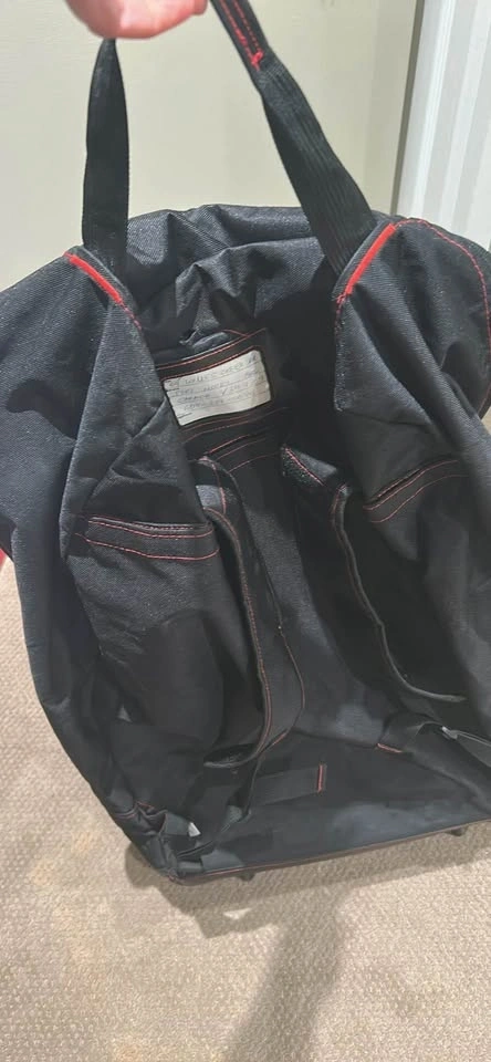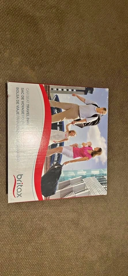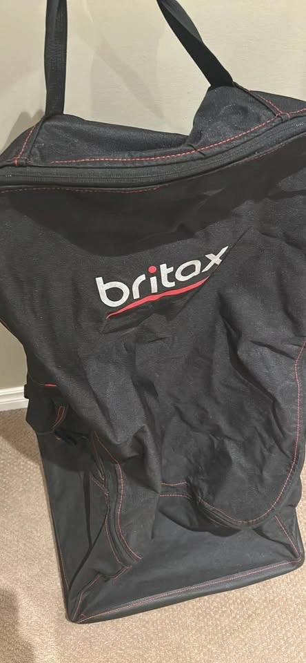 Britax car seat travel bag. Used for 2 trips. No rips or stains. Black with red stitching. Great for protecting car seats when you travel. Has handles for easy carrying. Comes in the original box.
