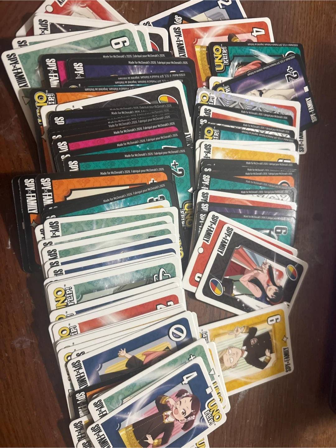 This UNO Flip! card game features characters from the popular Spy x Family series. The cards were made for McDonald's in 2026. It's a fun set for anime fans and card game players!