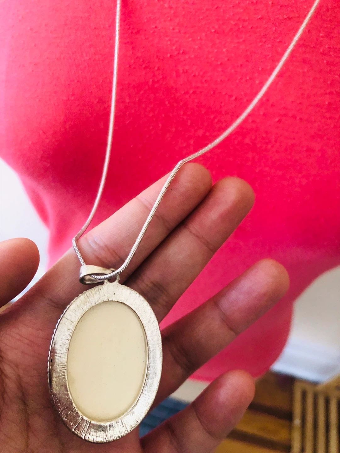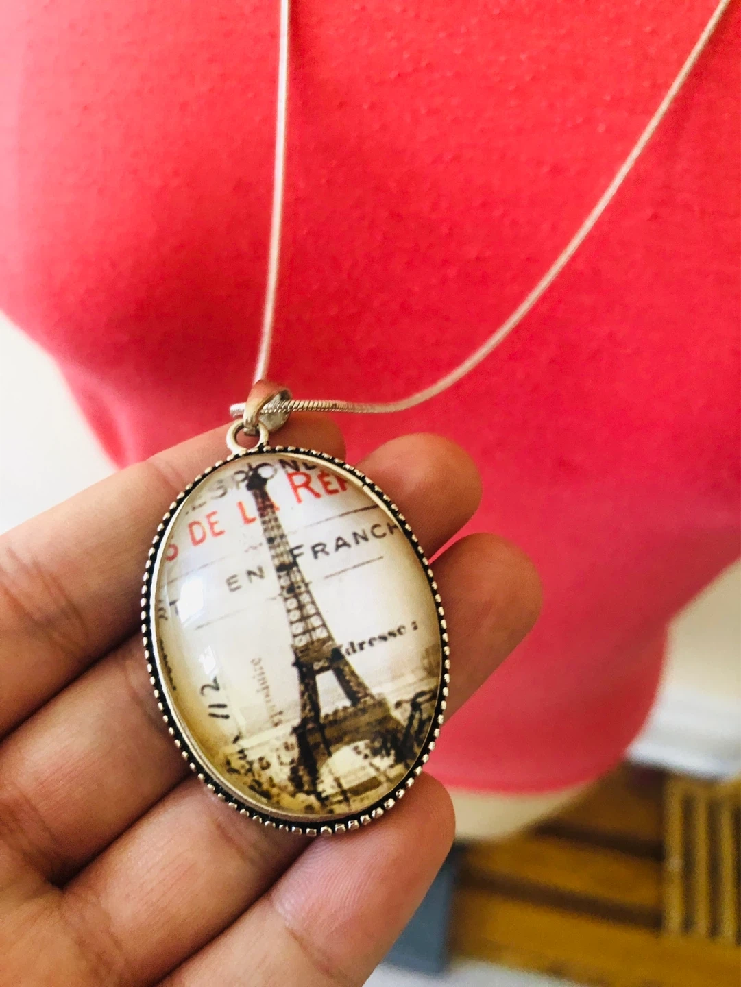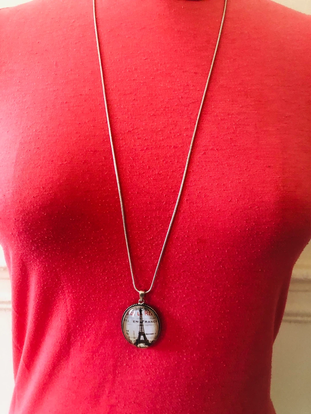This oval pendant necklace features a vintage-style image of the Eiffel Tower in Paris. The silver-tone chain has a lobster clasp closure. It's a charming accessory for anyone who loves travel or French style!