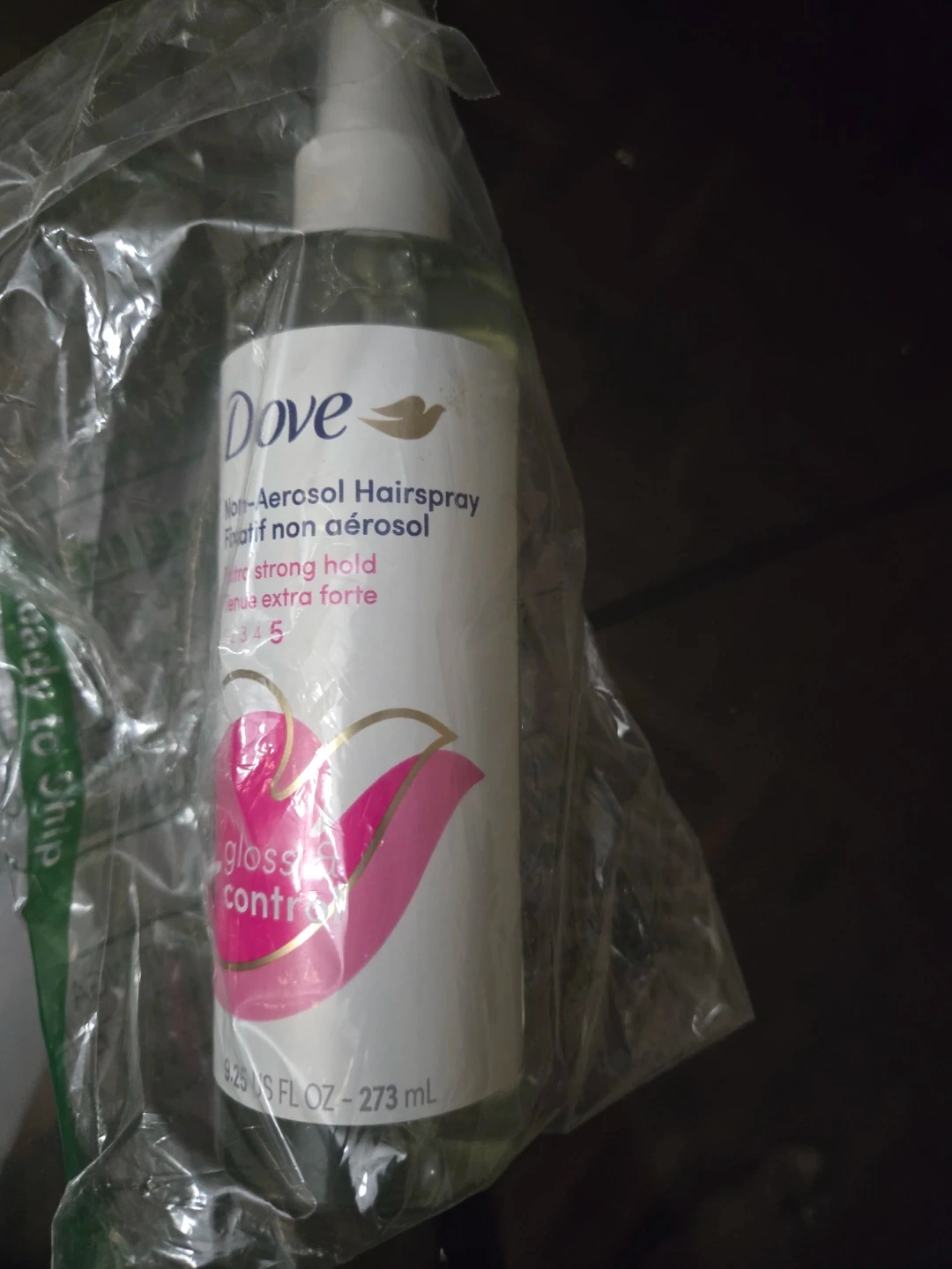 Selling a bottle of Dove Non-Aerosol Hairspray. It's the Extra Strong Hold version, perfect for keeping your hair in place. The bottle contains 9.25 US FL OZ - 273 mL, so it'll last you a while! Great for gloss and control