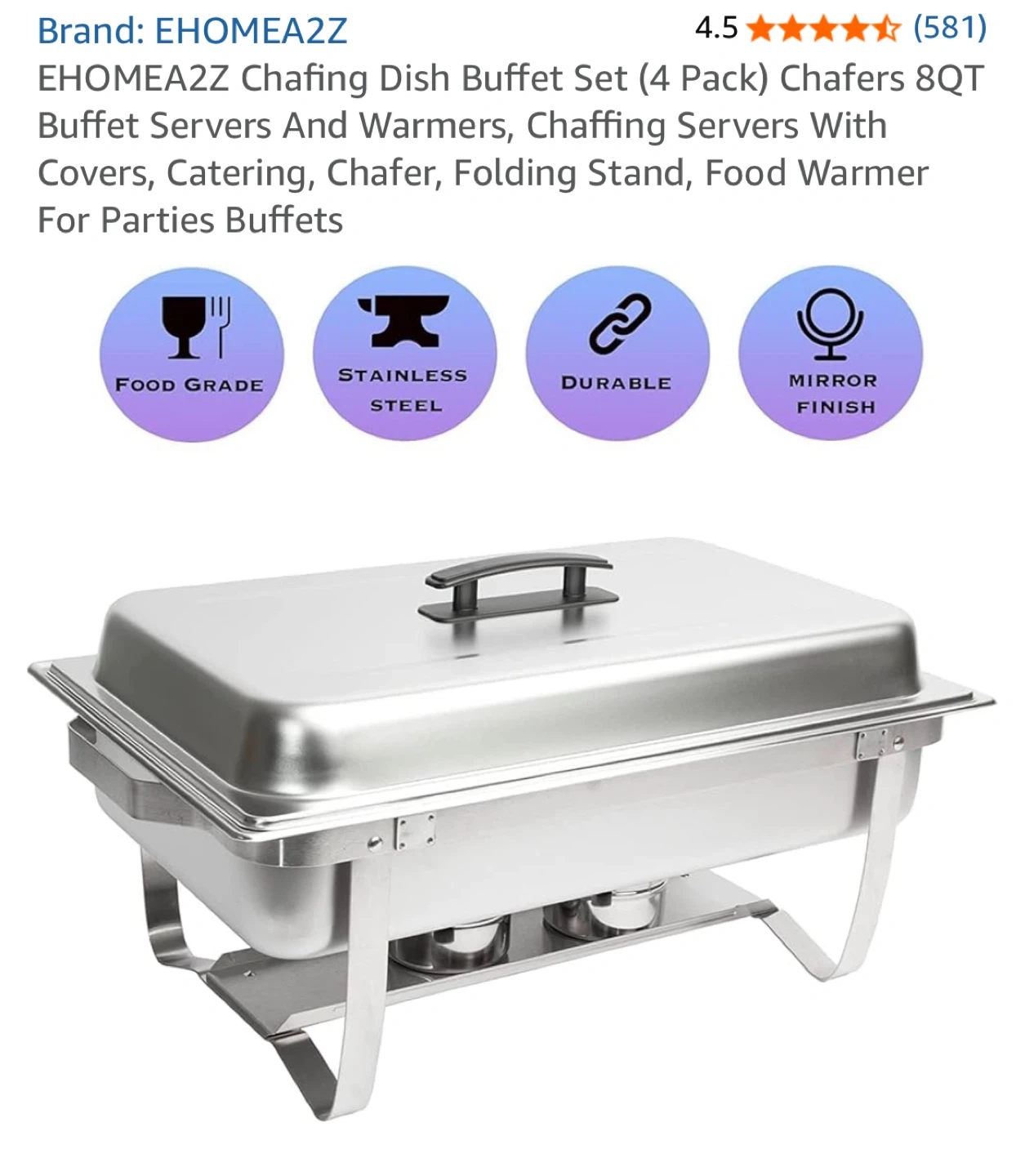 Get ready to host with this EHOMEA2Z chafing dish buffet set! This set includes 4 chafers, each with a generous 8QT capacity. Perfect for catering, parties, or buffets, these chafers come with covers, folding stands, and food warmers to keep your dishes at the right temperature. The set includes lids, 1/2 size food pans, water pans, fuel holders, foldable frames, and fuel holder trays. Serve in style!