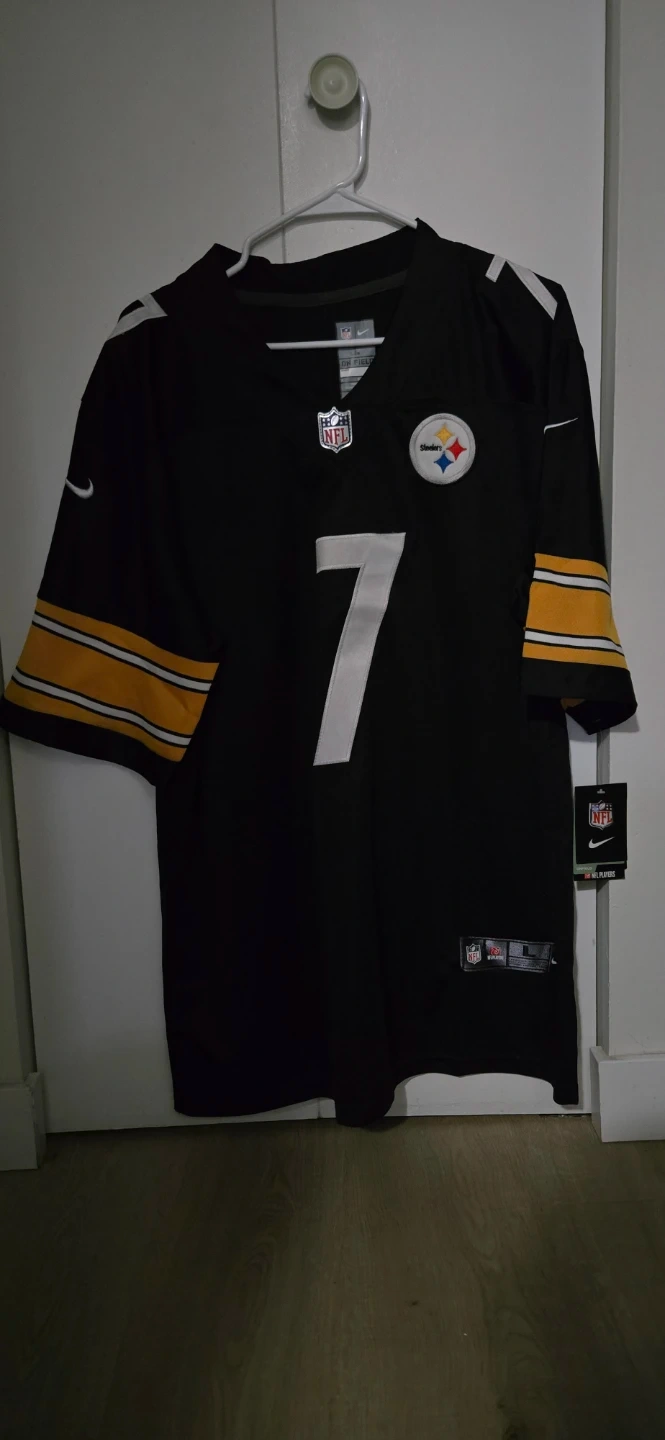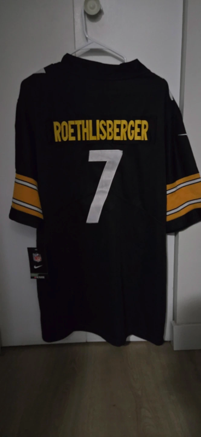 This is a Pittsburgh Steelers jersey with Ben Roethlisberger's name and number 7. It's a black replica jersey. Great for any Steelers fan!