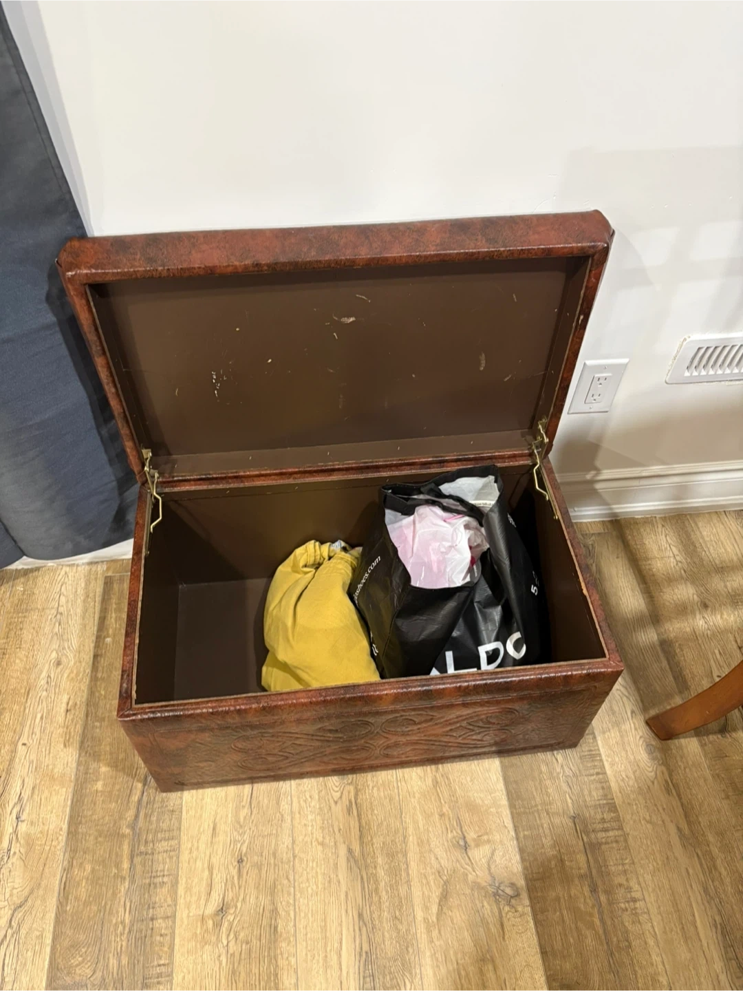 This faux leather storage ottoman has a rich, embossed design on the sides and a tufted lid. It's perfect for stowing away blankets, toys, or other household items. The interior is fully lined and hinged for easy access.